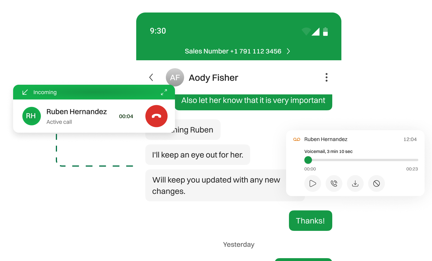 With Dialaxy, teams can manage calls from a shared number, so no customer inquiry goes unanswered. Internal messaging threads help teammates coordinate responses before replying. Use business hours and individual shift settings to ensure consistent availability. Missed calls and voicemails appear in a shared inbox, making it easier for team members to follow up in real time.