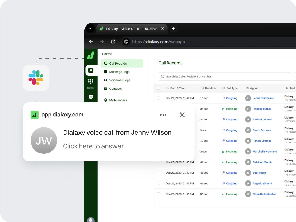 (Coming Soon) Slack Integration to Boost Team Productivity Unlock the full potential of your team’s collaboration efforts and streamline communication by harnessing the power of Slack integration. Connect Now Connect Now Endorsed by top industry leaders Trusted by industry experts for excellence and innovation. Streamlined Communication for Enhanced Productivity and Efficiency Seamlessly send and receive SMS messages within Slack channels, eliminating the need to switch between platforms. Seamless Integration with Existing Workflows Integrate SMS messaging seamlessly into your existing workflows within Slack, allowing team members to communicate via preferred channels. Centralized messaging Real-time SMS messaging Send and receive SMS messages directly within Slack channels, facilitating quick and efficient communication. Communication Channel Organization Organize slack channels to align with different projects, teams, or departments, ensuring clear communication and collaboration. Foster Real-time Collaboration Notification Management Customize alerts and notifications to ensure important SMS messages are prioritized and actioned promptly. Task Management Integrate task lists and reminders within Slack channels to streamline project management and workflow coordination. Seamless Integration with Existing Workflows Integrate SMS messaging seamlessly into your existing workflows within Slack, allowing team members to communicate via preferred channels. Centralized messaging Real-time SMS messaging Send and receive SMS messages directly within Slack channels, facilitating quick and efficient communication. Communication Channel Organization Organize slack channels to align with different projects, teams, or departments, ensuring clear communication and collaboration. Foster Real-time Collaboration Notification Management Customize alerts and notifications to ensure important SMS messages are prioritized and actioned promptly. Task Management Integrate task lists and reminders within Slack channels to streamline project management and workflow coordination. More Integrations Automate the data entry task, improve the agent performance and productivity to build relationships with customers. Show all Integrations Show all Integrations Intercom Enhance Your Help Desk Solution with Dialaxy's Calling and SMS Capabilities, Streamlining Support Operations and Amplifying Communication Efforts Crisp.chat Centralize Your Teams with Dialaxy's Unified Inbox, Consolidating More Than Just Phone Calls for Enhanced Collaboration and Efficiency Freshdesk Revolutionize Support Processes with Dialaxy's Seamless Calling, Automated Logging, and Synchronized Tickets for Enhanced Efficiency Frequently Asked Questions How does integrating Dialaxy with Slack benefit my team?Integrating Dialaxy with Slack enhances team communication by allowing you to send and receive SMS messages directly within Slack channels. This streamlines communication, centralizes messaging platforms, and improves collaboration among team members. How do I set up Dialaxy integration with Slack?Setting up Dialaxy integration with Slack is pretty simple. You can follow the step-by-step instructions provided by Dialaxy to connect your Dialaxy account with your Slack workspace. Once connected, you can start sending and receiving SMS messages within Slack. Is Dialaxy-Slack integration secure?Yes, Dialaxy-Slack integration is designed with security in mind. Our platform employs industry-standard security measures to protect your SMS communications, while Slack ensures data encryption and compliance with security standards. Can I use Dialaxy's SMS features within Slack?Yes, you can use Dialaxy’s SMS features within Slack channels. Once integrated, you can send SMS messages directly from Slack to contacts or groups. This makes it convenient to communicate with clients, partners, or team members who rely on SMS communication. Does Dialaxy-Slack integration support international SMS messaging?Yes, Dialaxy-Slack integration supports international SMS messaging. You can leverage Dialaxy’s international SMS capabilities to reach clients and stakeholders worldwide directly from your Slack workspace.