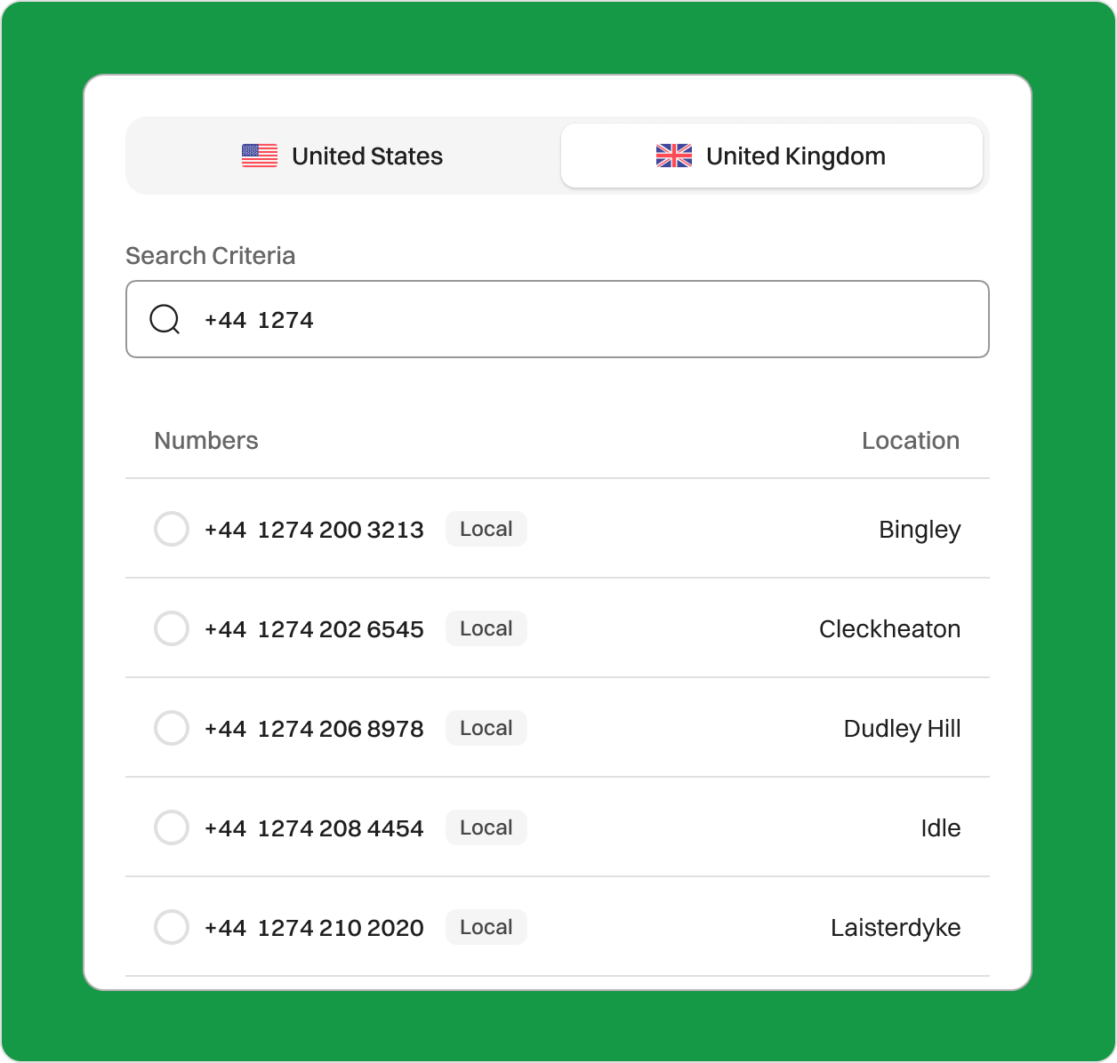 Get a 01274 Area Code Local Virtual Number for Bradford, UK Get a local phone number with the 01274 area code for Bradford. Enhance your local visibility, foster customer confidence, and enjoy smooth communication with a reliable virtual phone number. Sign upRequest a Demo Endorsed by top industry leaders Trusted by industry experts for excellence and innovation. What is the 01274 Area Code? The 01274 area code is a UK geographic dialing code assigned to Bradford, a major city in West Yorkshire. It is part of the UK’s national numbering plan and connects people and businesses throughout the Bradford area. Unlike North American overlays, the 01274 area code is not shared with other codes. Bradford uses Greenwich Mean Time (GMT) and switches to British Summer Time (BST) during daylight saving periods. Country United Kingdom Region West Yorkshire City Bradford Time Zone GMT / BST Telephone Format +44 1274 XXX XXXX Example +44 1274 555 678 Where is the 01274 Area Code? The 01274 area code is based in the UK and covers Bradford, one of England’s largest metropolitan districts. Known for its industrial roots, rich history, and thriving business scene, Bradford is situated in West Yorkshire, close to Leeds and Halifax. As part of the United Kingdom’s national numbering plan, it connects homes and businesses across Bradford, a major city known for its rich industrial heritage and diverse communities. Unlike in North America, UK area codes are not typically overlaid, so 1274 remains the sole code for the Bradford area. This makes it a familiar and trusted number for both residents and businesses. Calls made to 1274 numbers from outside the UK must include the country code (+44), followed by 1274 and the local number. It’s a key identifier for West Yorkshire communications. A Brief History of the 01274 Area Code The 01274 code was introduced on PhONEday, April 16, 1995, a national effort to expand the UK’s phone number capacity. This nationwide update added a ‘1’ after the initial ‘0’ in area codes to expand number capacity and future-proof the system against growing demand. Before this change, Bradford used the 0274 area code. The upgrade helped accommodate rising mobile use, population growth, and business demand, especially in growing cities like Bradford. PhONEday was a significant step in modernizing the UK’s telephone infrastructure, with public campaigns ensuring a smooth transition. Since then, 01274 has remained Bradford’s sole dialing code, anchoring the city’s telecommunications identity. The exclusive area code reinforces its identity as a vibrant economic and cultural hub in northern England. How to Get a 01274 Area Code Phone Number? You can purchase a 1274 area code phone number from a VoIP service provider like Dialaxy. Follow these simple steps: Sign up on the official Dialaxy website or mobile app. Log in to your dialaxy account. Search “My Number” from the “Portal” menu. Click on “Buy Number.” Choose the United Kingdom as your country and search for the 1274 area code. Complete the payment and submit any required documents. How Does a 01274 Area Code Business Phone Number Work? A 1274 area code business phone number provides your company with a dedicated line that connects you to customers in Bradford and the surrounding West Yorkshire region. It uses VoIP (Voice over Internet Protocol) technology, allowing you to make and receive calls over the internet instead of traditional landlines. This means you can use your business number from any device—smartphone, laptop, or desktop—regardless of your physical location. Whether you’re based in Bradford or managing operations remotely, a 1274 number gives your business a strong local presence. By choosing a 1274 number, your business also gains access to a variety of advanced communication features, including call forwarding, voicemail-to-email, auto-attendants, call recording, and SMS capabilities. These features enhance customer service and internal efficiency. Additionally, it’s a modern, cost-effective solution for businesses looking to establish or expand their reach in the Bradford market. It also helps you appear more credible to local customers, encouraging them to engage with a business they perceive as familiar and trustworthy. Dialing a 01274 Number Country Code (+44): Indicates the United Kingdom Area Code (01274): Routes to Leeds. Subscriber Number (e.g., 555 123): Unique to each phone line or business A 1274 number helps your business stand out in the Bradford region while maintaining professional connectivity. Who’s Doing Business in the 01274 Area Code? The 01274 area serves as a core telecom zone for Bradford’s diverse economy. Here’s who’s active in the region: Manufacturing & Engineering Bradford’s long-standing industrial base is still going strong. Companies in textiles, precision parts, and engineering use 01274 numbers to manage local and national operations. Firms like NG Bailey rely on these lines to coordinate suppliers and logistics. Film, Media & Creative Industries Bradford is a UNESCO City of Film, home to studios, artists, and content creators. Local numbers help them stay in touch with collaborators, clients, and cultural venues like Kala Sangam and the Science and Media Museum. Education & Research The University of Bradford and local colleges use 01274 numbers for admissions, student support, and research partnerships. Schools and training centers also stay connected to families through local lines. Healthcare & Life Sciences Hospitals like Bradford Royal Infirmary and clinics across the city use 01274 numbers to book appointments and handle patient calls. Health researchers and labs use them to stay in sync with NHS partners. Retail, Food & Hospitality Bradford’s shops, restaurants, and takeaways rely on local numbers for orders, bookings, and support. The city’s food scene—especially its curry houses—thrives on fast, familiar communication