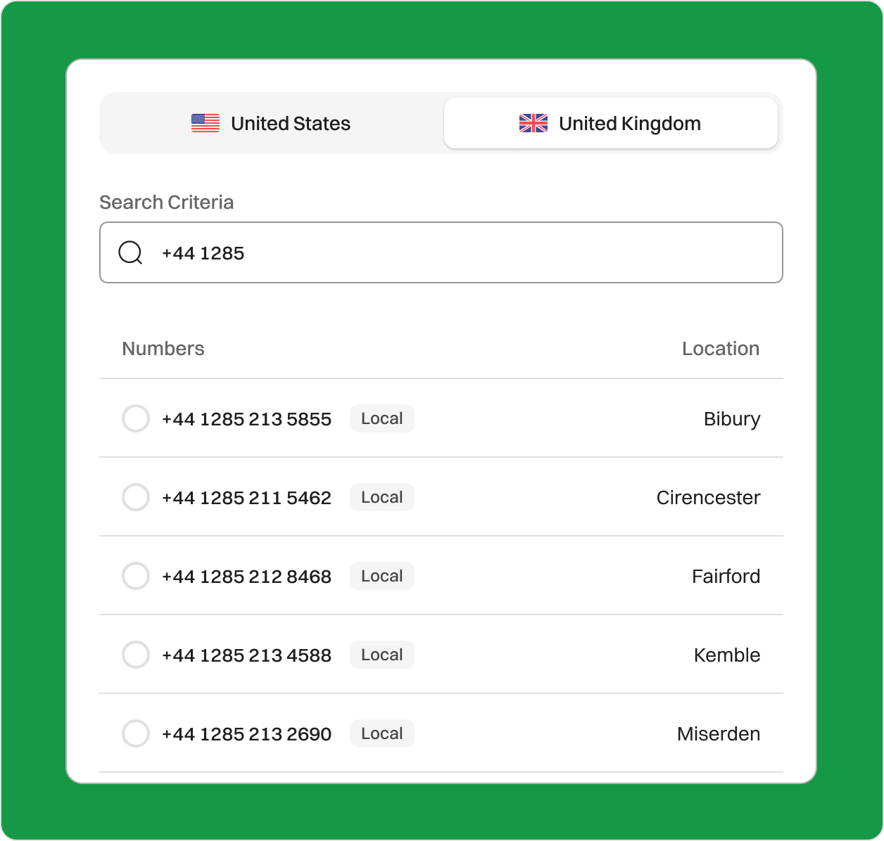 Get a 01285 Area Code Local Virtual Number for Cirencester, UK Establish a credible local presence in Cirencester, UK, and the surrounding Cotswolds with a 01285 area code virtual phone number for your business. This local phone solution can be a cornerstone of your communication strategy. Sign upRequest a Demo Endorsed by top industry leaders Trusted by industry experts for excellence and innovation. What is the 01285 Area Code? The 01285 area code, a key UK dialling code, serves Cirencester and its surrounding towns and villages in Gloucestershire, England, part of the picturesque Cotswolds region in the South West of England. It includes key locations like Cirencester, Gloucestershire, Fairford, and Lechlade, along with many other towns in Gloucestershire, England. Introduced as part of the Subscriber Trunk Dialing (STD) system, 01285 is a well-established UK phone code. Ofcom regulates the UK’s numbering plan. The area operates in the Greenwich Mean Time Zone (GMT) and observes British Summer Time (BST). Country United Kingdom Region Cotswolds, Gloucestershire City Cirencester Time Zone Greenwich Mean Time (GMT)/BST Telephone Number Format +44 1285 XXX XXX/p> Example of 01285 Number +44 1285 123 456 Where is the 01285 Area Code? The 01285 area code is located in the United Kingdom and covers a significant portion of the Cotswolds in Gloucestershire, England. While not one of the UK’s major cities, Cirencester is a key town, often referred to as the “Capital of the Cotswolds.” Other notable cities and villages, such as Fairford and Lechlade-on-Thames, as well as smaller communities like Ampney Crucis, also fall within the 01285 dialing region. The 01285 dialling code exclusively serves these locations. Full national dialling is standard. Despite changes over the decades, 01285 remains a recognizable and trusted code phone for people in and around Cirencester, Gloucestershire. A Brief History of the 01285 Area Code Area code 01285 was introduced as part of the United Kingdom’s Subscriber Trunk Dialling (STD) system, which began its ambitious rollout in December 1958. Cirencester, UK, and its surrounding areas in Gloucestershire, England, were originally assigned the dialling code 0285 during this progressive national implementation, which aimed to allow callers to make long-distance calls directly without operator assistance. The UK’s telephone numbering plan has evolved over the decades, with notable updates such as PhONEday in 1995, when a ‘1’ was added after the initial ‘0’ in all geographic area codes, turning 0285 into 01285. This was followed by the “Big Number Change” in 2000. The 01285 code has consistently served the Cirencester Gloucestershire area, maintaining its distinct local identity and providing a stable communication link for residents and businesses in this part of the South West. How to Get a 01285 Area Code Phone Number? You can purchase a 01285 area code phone number from a VoIP service provider like Dialaxy. Follow these simple steps: Sign up on the official Dialaxy website or mobile app. Log in to your Dialaxy account. Search “My Number” from the “Portal” menu. Click on “Buy Number.” Choose a country and search for the 01285 area code. Complete the payment and submit any required documentation. How Does a 01285 Area Code Business Phone Number Work? A 01285 area code business phone number gives your company a professional phone line that connects you with customers in Cirencester and nearby Cotswold areas. It works using VoIP (Voice over Internet Protocol) technology, which lets you make and receive calls over the internet instead of using traditional phone lines. This means you can use your 01285 number from any device, like a mobile phone, computer, or tablet, no matter where you’re located. Whether you’re based in Cirencester, working remotely from Milton Keynes, or managing operations from another city, your business will still appear local to customers in the Cotswolds. You’ll also get access to helpful features that make customer communication easier. These include call forwarding, voicemail-to-email, auto-attendants, and call recording. With these tools, you can reduce missed calls, manage conversations efficiently, and improve your customer service. Using a 01285 area code makes your business feel more local and trustworthy to customers in the region. It gives your brand a strong local identity, helps build customer confidence, and is a smart, flexible option for businesses wanting to grow in the Cirencester and Cotswold market. Dialing a 01285 Number Country Code (+44): Indicates the United Kingdom Area Code (01285): Routes the business call to the Cirencester area. Subscriber Number (e.g., 123 456): Unique to each phone line. A 01285 number helps your business stand out. Who's Doing Business in the 01285 Area Code? The Cirencester area code (01285) serves as a vital communication link for a diverse range of industries and institutions across Cirencester, Gloucestershire, and the wider Cotswolds in South West England: Tourism & Hospitality Businesses such as hotels, quaint B&Bs, holiday cottage rentals, and local tour operators rely heavily on 01285 numbers to connect with visitors and manage bookings in this popular tourist destination. Agriculture & Rural Enterprises Farming businesses, equestrian centres, and various rural service providers use local 01285 numbers for their daily operations and to liaise with suppliers and customers throughout Gloucestershire, England. Retail & Local Commerce Cirencester's vibrant high street shops, independent boutiques, antique dealers, and essential local service providers use 01285 numbers to serve their community and manage customer inquiries. Professional Services Firms, including solicitors, accountants (perhaps structured as a Finance Ltd or Contracts Ltd), estate agents, and various consultancies, utilize 01285 numbers to offer their expertise to local clients. Educat