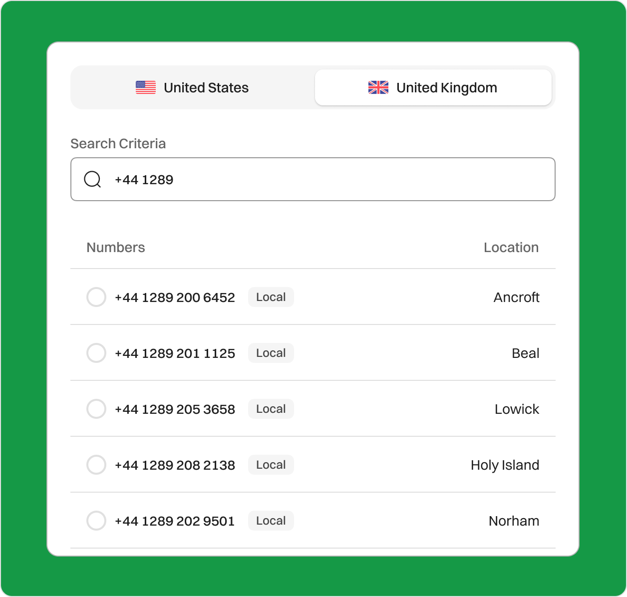Get a 01289 Area Code Local Virtual Number for Berwick-upon-Tweed, UK Looking to connect with customers in Berwick-upon-Tweed? A 01289 area code virtual number gives your business a local voice, helping you build trust, feel part of the community, and stay in touch easily, no matter where you’re working from. Sign upRequest a Demo Endorsed by top industry leaders Trusted by industry experts for excellence and innovation. What is the 01289 Area Code? The 01289 area code is a UK telephone code that connects you to Berwick-upon-Tweed in Northumberland. If you’ve ever received a call starting with 01289, it likely came from someone in this historic border town or the nearby surrounding countryside along the northeast coast of England. This area code is part of the UK’s national numbering system and is specifically assigned to landline phones in and around Berwick-upon-Tweed. Whether it’s a local business, a long-time resident, or a seaside B&B reaching out, a 01289 number signals a Northumberland connection. There’s only one area code for this region, and it follows UK time—Greenwich Mean Time (GMT) during the winter months and British Summer Time (BST) when daylight saving is in effect. Country United Kingdom Region Northumberland Town Berwick-upon-Tweed Time Zone GMT / BST Telephone Number Format +44 1289 XXX XXX Example of 01289 Number +44 1289 555 123 Where is the 01289 Area Code? The 01289 area code is located in the United Kingdom and covers Berwick-upon-Tweed, a coastal town in Northumberland near the Scottish border. Known for its rich strategic location, Berwick is a key point of interest in northern England. The 01289 dialing code covers the entire town and surrounding rural areas, including places such as Tweedmout, Spittal, and Scremerston. It is a geographical area code, meaning it is tied to this specific location and helps identify local landline numbers. Unlike the overlay system used in some other countries, UK geographic area codes like 01289 are exclusive to their regions. Calls made to 01289 numbers from outside the UK must include the country code (+44), followed by 1289 and the local number. This dialing code is an important communication link for businesses and residents across the Northumberland border region. A Brief History of the 01289 Area Code The 01289 area code has been connecting the people of Berwick-upon-Tweed for decades. It was introduced as part of the UK’s nationwide “PhONEday” update on April 16, 1995. Before that, Berwick residents used the shorter 0289 code. Adding the extra ‘1’ in the prefix was a necessary step to ensure communities like Berwick could stay connected in a rapidly changing world. For a town with centuries of shifting borders and identity, the 01289 code became something stable—an anchor for communication in homes, businesses, and public services alike. Even now, 01289 remains a distinct and trusted part of daily life in Berwick, linking the past with the present in one of England’s most unique northern towns. How to Get a 01289 Area Code Phone Number? You can purchase a 01289 area code phone number from a VoIP service provider like Dialaxy. Follow these simple steps: Sign up on the official Dialaxy website or mobile app. Log in to your Dialaxy account. Search “My Number” from the “Portal” menu. Click on “Buy Number.” Choose the United Kingdom as your country and search for the 01289 area code. Complete the payment and submit any required documentation. How Does a 01289 Area Code Business Phone Number Work? A 01289 area code business phone number works by providing your company with a dedicated line that connects you to customers in Berwick-upon-Tweed and surrounding areas. It uses VoIP technology, allowing you to make and receive calls over the internet. Whether you’re a startup looking to build local trust or an established company expanding into Northumberland, a 01289 number bridges the gap. You can use it on your mobile, laptop, or desktop—whatever suits your workflow best. All you need is an internet connection. Using a 01289 number also makes your business look more approachable and trustworthy to locals. When people see a familiar area code on their caller ID, they’re more likely to pick up the phone and engage. For businesses looking to grow in the Northumberland region, a 01289 number is an easy and cost-effective way to make meaningful connections with the community. Dialing a 01289 Number Country Code (+44): Indicates the United Kingdom Area Code (01289): Routes the call to Berwick-upon-Tweed Subscriber Number (e.g., 555 123): Unique to each phone line or business A 01289 number allows your organization to establish a trusted presence in Berwick-upon-Tweed while leveraging cost-effective digital telephony. Who’s Doing Business in the 01289 Area Code? The 01289 area code supports a wide variety of businesses and organizations across Berwick-upon-Tweed and the surrounding region. Here’s a closer look at some of the key industries operating in the area: Healthcare Services Health providers in Berwick rely on local numbers for accessible healthcare. The Well Close Medical Group, one of the town’s primary GP practices, uses a 01289 number to coordinate patient appointments and medical support across the community. Agriculture & Food Production The surrounding countryside is home to a strong agricultural community. Local producers like Berwick Shellfish Company, known for delivering fresh seafood from the Northumberland coast, use 01289 lines to handle wholesale orders and supply logistics. Education Local government offices and schools form the backbone of the community. Berwick Academy, the town’s secondary school, uses a 01289 number for communication with parents, students, and local partners. Retail & Small Business From independent shops to family-run services, local businesses use the 01289 area code to stay close to their community. Ford's of Berwick, a well-known clothi