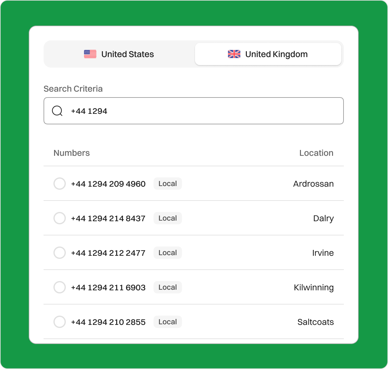 Get a 01294 area code virtual number for your business in Ardrossan, North Ayrshire. This local number builds trust with customers and ensures seamless communication for easy client access.