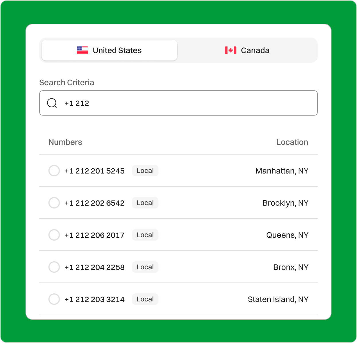 • Select Country and Area Code: Choose “United States” as the country, and then select the 212 area code.