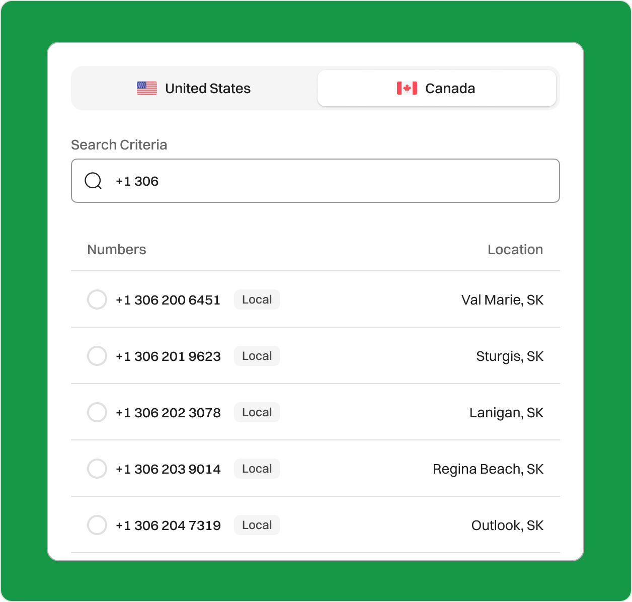 Get a 306 Area Code Local Virtual Number for Saskatchewan, Canada Get a 306 area code virtual number for your business in Saskatchewan. Strengthen your local presence, build customer trust, and ensure seamless communication with a dependable virtual phone number. Sign upRequest a Demo Endorsed by top industry leaders Trusted by industry experts for excellence and innovation. What is the 306 Area Code? The 306 area code is Saskatchewan’s original area code, serving the entire province. As part of the North American Numbering Plan (NANP), it covers cities such as Regina, Saskatoon, Prince Albert, Moose Jaw, and North Battleford. Introduced in 1947 as one of Canada’s first area codes, it initially served the whole province. Due to increased demand for numbers, overlays 639 and 474 were added in 2013 and 2021, respectively. Area code 306 continues to serve all of Saskatchewan alongside these overlays. The province operates within the Central Time Zone (CT), observing UTC-6 year-round without daylight saving time adjustments in most areas. Country Canada Province Saskatchewan Cities Regina, Saskatoon, Moose Jaw Time Zone Central Time Zone (CT) Format +1(306)-XXX-XXXX Example +1 (306) 789-1234 Where is the 306 Area Code? The 306 area code covers the entire province of Saskatchewan, Canada. It includes cities such as Regina, Saskatoon, Moose Jaw, Prince Albert, North Battleford, and smaller communities like Langham, Pense, Esterhazy, Ituna, and Punnichy. As part of an overlay system with area codes 639 and 474, residents and businesses use 10-digit dialing (area code + phone number) for local calls. This setup ensures a consistent supply of new phone numbers without altering existing ones. A Brief History of the 306 Area Code Area code 306 was established in 1947 as one of the original 86 area codes under the NANP, initially serving all of Saskatchewan. For decades, it was the province’s sole area code. In response to growing population and telecommunications needs, Saskatchewan implemented its first overlay in 2013 with the introduction of area code 639. More recently, a second overlay, area code 474, was added on October 2, 2021, to further expand the numbering capacity. Despite these changes, 306 remains a central and recognizable part of Saskatchewan’s communication infrastructure. These adjustments, as approved by the Canadian Numbering Administrator, ensure that residents and businesses across Saskatchewan have access to reliable and flexible telephone services. How to Get a 306 Area Code Phone Number? You can purchase a 306 area code phone number from a VoIP service provider like Dialaxy. Just follow these steps: Sign up on the official Dialaxy website or app. Log in to your Dialaxy account. From the “Portal” menu, navigate to “My Number.” Click on “Buy Number.” Select Canada and enter the 306 area code. Submit payment and any required documents. How Does a 306 Area Code Business Phone Number Work? A 306 area code business number uses VoIP technology to connect your company with customers across Saskatchewan. As part of Canada’s national telecom grid, it allows businesses to build a local identity. Here’s how it works: Local Presence A local 306 number builds trust among customers across Saskatchewan. Internet-Based Communication VoIP allows you to make and receive calls from smartphones, tablets, or computers. Call Routing Smart call routing routes Calls intelligently to the appropriate team or department. Seamless Accessibility Connect with clients anywhere while presenting a local Saskatchewan number. Value-Added Features Enjoy services like voicemail-to-email, text messaging, call forwarding, and more. Dialing a 306 Number Country Code (1): Identifies Canada Area Code (306): Routes the call to Saskatchewan Local Exchange (e.g., 789): Targets a specific region or carrier Subscriber Number (e.g., 1234): Designates the individual line With Dialaxy, your 306 area code number offers modern call management tools to support your business communications across Saskatchewan. Who’s Doing Business in the 306 Area Code? The economy in Saskatchewan spans a wide range of industries, with the 306 area code acting as a recognizable and trusted point of contact for businesses throughout the province. From agriculture and mining to healthcare and retail, companies across Saskatchewan use the 306 area code to build trust and maintain strong communication links within their communities. Agriculture As one of the most agriculturally productive provinces in Canada, Saskatchewan is home to vast farmlands and a thriving farming economy. Grain producers, pulse crop growers, and livestock operations are major contributors to the province’s GDP. Businesses in this sector benefit from having a 306 number to communicate efficiently with local distributors, buyers, cooperatives, and agricultural service providers. Mining & Natural Resources Saskatchewan is a global leader in potash and uranium production, with significant mining operations near cities like Esterhazy and Saskatoon. Mining companies, support service firms, and energy consultants use 306 numbers to coordinate operations, manage logistics, and stay connected with stakeholders across the province. Healthcare & Medical Services Cities like Regina and Saskatoon host major hospitals and medical research facilities, forming the backbone of Saskatchewan’s healthcare network. From family clinics to specialized practices and telehealth providers, a 306 number ensures reliable communication for both urban and rural patients, enhancing care delivery and follow-up. Education & Public Services The province’s universities, such as the University of Saskatchewan and University of Regina, along with public service institutions, play a key role in the regional economy. Education professionals, school boards, and government departments rely on 306 numbers to maintain consistent and secure communication with students, parents, and resid