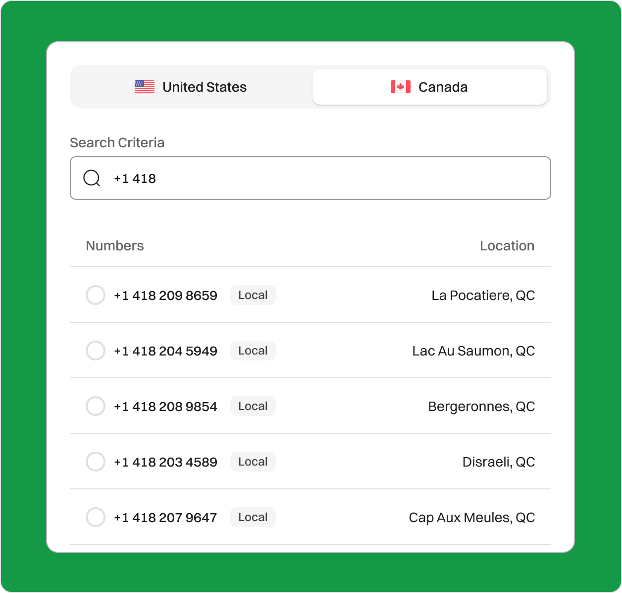 Get a 418 Area Code Virtual Number for Quebec City Get a 418 area code virtual number for your business in Quebec City or other parts of eastern Quebec. The 418 area code covers major cities like Quebec City, Lévis, Saguenay, and Rimouski. By using a local number, you can strengthen your presence in the region, build trust with local customers, and enjoy seamless communication through a reliable virtual phone system. Sign upRequest a Demo Endorsed by top industry leaders Trusted by industry experts for excellence and innovation. What is the 418 Area Code? The 418 area code is one of Canada’s original area codes, introduced in 1947 as part of the North American Numbering Plan (NANP). It serves eastern Quebec, including major cities such as Quebec City, Saguenay, Lévis, Rimouski, and Rivière-du-Loup. To accommodate the growing demand for new numbers, area code 418 has been overlaid by area codes 581 and 367. The region operates within the Eastern Time Zone (ET) — UTC-5 during standard time and UTC-4 during daylight saving time Country Canada Province Quebec City Quebec City Time Zone Eastern Time Zone Telephone Number Format +1(418)-XXX-XXXX Example of 418 Phone Number +1(418)-555-6789 Where is the 418 Area Code? The 418 area code covers a vast portion of eastern Quebec, Canada. It includes key cities and regions like Quebec City, Saguenay, Lévis, and the Gaspé Peninsula. As a foundational area code in Canada, it supports both residential and business communications across the province. Today, 418 functions alongside overlays 581 and 367. These overlays ensure a continued supply of phone numbers in the region. As a result, 10-digit dialing is mandatory for all local calls in the area. A Brief History of the 418 Area Code The 418 area code was created in 1947 and initially covered the entire province of Quebec. As demand for telecommunications increased, area code 514 was split off in 1957 to serve southwestern Quebec, including Montreal. By 2008, the need for more numbers prompted the introduction of overlay area code 581. In 2018, area code 367 was added as a second overlay to meet further growth in the region. Despite these additions, the 418 code remains a widely recognized and respected identifier for eastern Quebec. How to get a 418 Area Code Phone Number? You can purchase a 418 area code phone number from a VoIP service provider like Dialaxy. Follow these simple steps: Sign up on the official Dialaxy website or mobile app. Log in to your Dialaxy account. Search “My Number” from the “Portal” menu. Click on “Buy Number.” Choose Canada as your country and search for the 418 area code. Complete the payment and submit any required documents. How does a 418 Area Code Business Phone Number work? A 418-area-code business phone number uses VoIP (Voice over Internet Protocol) technology to help your business connect with customers in Quebec. Calls are made using internet-based systems for flexibility and efficiency. The Canadian telecommunications network assigns unique phone numbers that are dialed using a 10-digit format (area code + local number). Here’s how it enhances your business communication: Local Presence A 418 area code gives your business a familiar and local identity in Quebec City, Saguenay, and nearby regions, making it easier to win customer trust. Internet-Based Communication Make and receive calls using smartphones, computers, or VoIP phones, offering flexibility no matter where your team is based. Call Routing Dialaxy’s intelligent call routing directs incoming calls to the correct department or team instantly, improving customer service. Seamless Accessibility Even if you’re located outside Quebec, a 418 number makes your business feel local to customers in the region. Value-Added Features Your 418 number comes with features like call forwarding, voicemail-to-email, auto-attendants, and SMS capabilities to streamline your communication process. Dialing a 418 Number Country Code (1): Indicates Canada Area Code (418): Routes the call to Eastern Quebec Local Exchange (e.g., 555): Points to a specific city like Quebec City Subscriber Number (e.g., 6789): Identifies the unique phone number Using a 418 area code business number helps you build a reliable communication channel in Eastern Quebec that feels local, even from afar. Who’s doing business in the 418 Area Code? The 418 area code supports key industries across Eastern Quebec. Here are some of the top business sectors using this area code: Tourism & Hospitality The 418 area code powers Quebec’s thriving tourism sector. Fairmont Le Château Frontenac, one of Canada’s most iconic hotels, uses a 418 number to handle reservations and guest services. Local tour operators like Cicérone Tours also rely on 418 lines to coordinate walking tours in Old Quebec and beyond. Maritime & Shipping The Port of Québec and Groupe Desgagnés, a major maritime transport company headquartered in Quebec City, operate using 418 numbers to manage cargo logistics and vessel schedules. These numbers ensure real-time coordination across shipping routes on the St. Lawrence River. Forestry & Natural Resources Companies like Scierie Dion & Fils, located in Saint-Raymond, use 418 numbers for inter-site communication in their logging and sawmill operations. In a region where forestry is vital, local connectivity helps link remote forest zones with administrative hubs. Government & Education The Université Laval in Quebec City, a leading research university, uses 418 phone numbers for academic inquiries, admissions, and campus operations. Government departments such as the Ministère de la Santé et des Services sociaux also use 418 numbers for public service communication. Healthcare Services Major medical institutions like the CHU de Québec–Université Laval, which includes several hospitals and clinics, rely on 418 numbers for appointment scheduling, emergency coordination, and patient care across the region. Techno