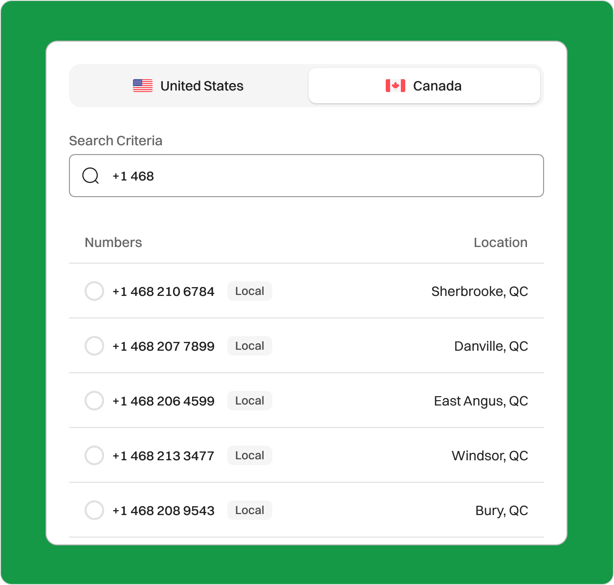 Get a 468 Area Code Local Virtual Number for Sherbrooke, Québec Get a 468 area code virtual number for your business in Sherbrooke, Québec. Strengthen your local presence, build customer trust, and ensure seamless communication with a dependable virtual phone number. Sign upRequest a Demo Endorsed by top industry leaders Trusted by industry experts for excellence and innovation. What is the 468 Area Code? The 468 area code is a newer area code for Québec, Canada, specifically serving the northwestern area. As part of the North American Numbering Plan (NANP), it is an overlay for the 819 and 873 area codes and works alongside these existing area codes. Introduced in 2022, the 468 area code was implemented to ensure a continued supply of phone numbers in this region of Québec. It does not replace existing codes but rather functions as an additional overlay. All numbers in this area require 10-digit dialing due to the overlay system. The region operates within the Eastern Time Zone (ET), observing UTC-5 during standard time and UTC-4 during daylight saving time. Country Canada State/Province Québec City Northwestern Québec Sherbrooke Time Zone Eastern Time Zone (ET) Telephone Number Format +1(468)-XXX-XXXX Example Phone Number +1 (468) 555-7890 Where is the 468 Area Code? The 468 area code serves the northwestern region of Québec, Canada. It is an overlay area code that works in conjunction with area codes 819 and 873 to serve cities such as Gatineau, Sherbrooke, Rouyn-Noranda, Val-d’Or, and surrounding communities. Introduced in 2022, area code 468 was implemented to meet the growing demand for new phone numbers in this part of Québec. As an overlay, it does not replace existing numbers in the 819 and 873 regions. Instead, it allows for the continued issuance of new phone numbers without disrupting current users. Due to the overlay system, 10-digit dialing (area code + 7-digit number) is mandatory for all local calls within the area. A Brief History of the 468 Area Code Area code 468 is one of the newest additions to Canada’s telecommunications system. It was approved by the Canadian Radio-television and Telecommunications Commission (CRTC) and activated in August 2023. It was introduced as a relief measure to accommodate the growing demand in northwestern Québec, following the need for more numbers in the 819 and 873 area codes. Rather than splitting geographic boundaries, the overlay method was chosen to simplify the transition. The 468 overlay ensures sufficient numbering resources for this region of Québec. Like other overlay codes, it supports landlines, mobile devices, VoIP services, and more without requiring changes to existing numbers. According to the Canadian Numbering Administrator (CNA), these changes were essential to support the city’s expanding population and increasing demand for new phone numbers. How to Get a 468 Area Code Phone Number? You can purchase a 468 area code phone number from a VoIP service provider like Dialaxy. Follow these steps: Sign up on the official Dialaxy website or mobile app. Log in to your Dialaxy account. Search “My Number” from the “Portal” menu. Click on “Buy Number.” Choose Canada as your country and search the 468 area code. Complete the payment and submit any required documents. How Does a 468 Area Code Business Phone Number Work? A 468 area code business phone number uses VoIP technology to connect you with customers across northwestern Québec and the surrounding area. As part of Canada’s national telecom network, it provides a trusted local identity for businesses. Here’s how it works: Local Presence A local number builds trust with customers in Quebec and the GTA. Internet-Based Communication VoIP numbers can be used on smartphones, tablets, or desktops via apps and softphones. Call Routing Advanced systems perform call routing efficiently, ensuring prompt service and internal coordination. Value-Added Features Providers include call forwarding, voicemail transcription, voicemail-to-email, SMS, and more. Dialing a 468 Number Country Code (1): Represents Canada Area Code (468): Routes the call to the Quebec overlay area Local Exchange (e.g., 555): Refers to a specific neighborhood or district Subscriber Number (e.g., 7890): Unique to each phone line With Dialaxy, you gain a feature-rich virtual number service that offers flexibility, reliability, and local engagement for your Quebec-based audience. Who’s Doing Business in the 468 Area Code? Quebec’s economy is vibrant and diverse, and the 468 area code helps connect businesses with customers in this metropolitan hub. Finance & Banking While Montréal also has a significant financial sector, the 468 area code, serving northwestern Québec, can help businesses there establish a local presence within that region's financial activities, connecting with local credit unions, financial advisors, and related services. A 468 area code enhances business credibility and ensures that partners, clients, and institutions recognize your operation as locally established within northwestern Québec. Technology & Innovation While Montréal has a strong technology and innovation sector, businesses in northwestern Québec with a 468 number benefit from being identified as part of that region's developing ecosystem. A local number supports smoother engagement with both customers and collaborators there. Education & Professional Services Northwestern Québec has its own educational institutions and professional services. A 468 number fosters trust and allows seamless interaction with students, clients, and local networks in that part of the province. Retail & E-Commerce Having a recognizable local number in northwestern Québec helps connect with customers, improves conversion, and supports brand authenticity within that market. A 468 area code establishes a strong local identity there. Real Estate & Construction The real estate and construction sectors in northwestern Québe