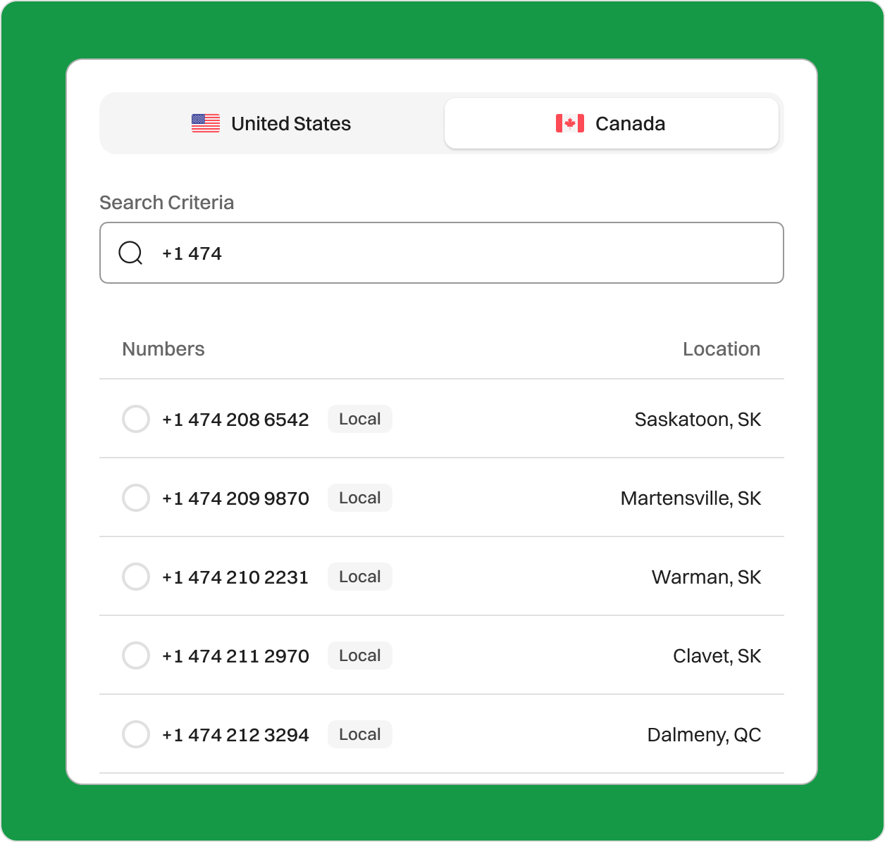 • Choose Canada as your country and search the 474 area code.