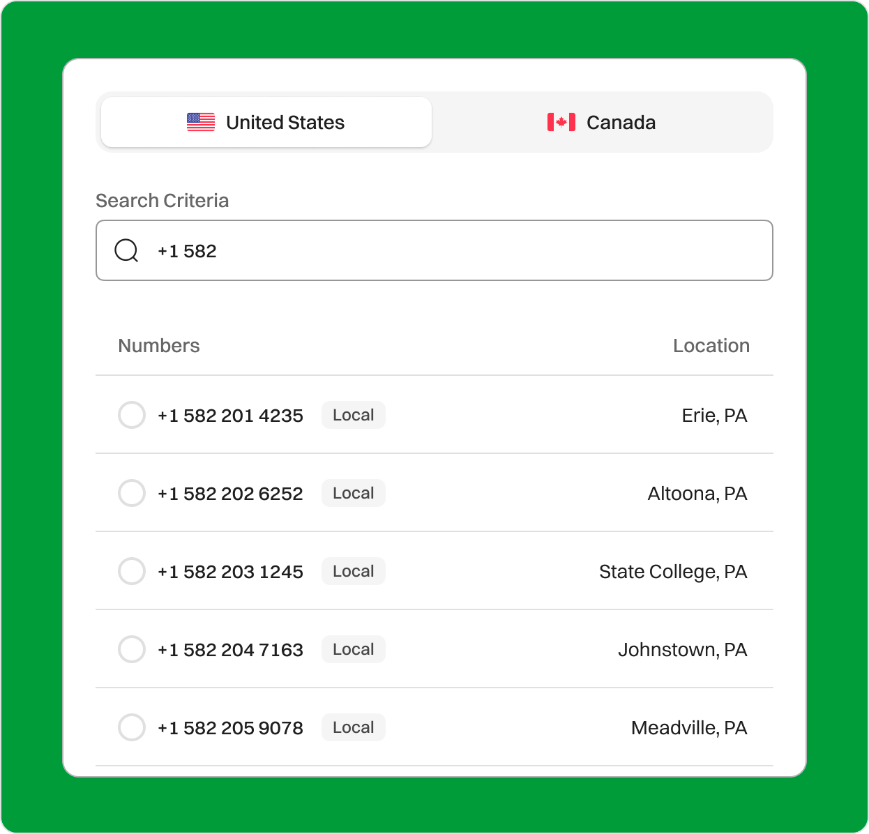Grow Your Business in Pennsylvania with a 582 Area Code Virtual Number! Looking to expand your reach in Pennsylvania? A 582 area code phone number can help you connect with communities across cities like Erie, Altoona, State College, and Meadville, whether you’re a budding local business or an established enterprise. Sign upRequest a Demo Endorsed by top industry leaders Trusted by industry experts for excellence and innovation. What is Area Code 582? Area code 582 is a telephone area code designed as part of the North American Numbering Plan (NANP) that covers parts of northwestern and central Pennsylvania, including cities like Erie, State College, Altoona, Meadville, and Oil City. The 582 area code covers over 20 counties, including Centre, Erie, Cambria, and Clarion, among others. It was introduced on May 1, 2021, as an overlay area code to area code 814. As the population steadily increased, the 814 area code could no longer accommodate the residents’ need for telephone numbers, which prompted the Pennsylvania Public Utility Commission to announce a new 582 area code. All calls in the area became ten-digit dialing (area code + 7 digits). Therefore, a 582 virtual phone number from a trusted provider like Dialaxy helps you reach more customers in Pennsylvania cities and counties like Erie, Altoona, and State College. Country USA State Pennsylvania Major City Erie Time Zone Eastern Time Zone(EST) Telephone Number Format +1 (582)-XXX-XXXX Example of a 582 phone number +1 (582)-238-4567 Zip Code 16501 (Erie), 16801 (State College), 16601 (Altoona) How to Get a 582 Area Code Phone Number? You can purchase a 582 area code number from a service provider like Dialaxy. Follow these simple steps. Sign up on the official Dialaxy website or mobile app. Log in to your account and navigate to the dashboard. Select “My Number” from the “Portal” menu. Click on “Buy Number.” Select the country “U.S.” and area code 582 from the list. Complete the payment process and submit any documents if required. How Does a 582 Area Code Business Phone Number Work? A 582 phone number functions just like any other phone number, enabling both incoming calls and outgoing calls. It identifies your business locally, enhancing trust and accessibility among Pennsylvania residents while also offering global connectivity. First, a customer calls your 582 phone number. The call is routed to your preferred destination. The area code 582 covers regions of Pennsylvania, which follow Eastern Time (ET), including adjustments for Daylight Saving Time. Dialing a 582 phone number: Country Code (1): Represents the United States. Area Code (582): Directs the call to northwestern and central Pennsylvania. Local Exchange (e.g., 474): A three-digit code identifying the carrier. Subscriber Number (e.g., 9132): The unique four-digit number assigned to the recipient. With Dialaxy, a 582 area code number gives access to powerful features such as call recording, call forwarding, voicemail-to-email, and smart call routing to keep your communication seamless. You can also easily grow your local marketing initiatives not only in northwestern Pennsylvania but also in nearby communities. Dialaxy’s virtual phone system allows you to manage live calls, voicemail greetings, and business text messages from one phone system. Who’s Doing Business in the 582 Area Code? With a population of approximately 1.8 million (as of 2024), Pennsylvania values local businesses that cater to its needs. Pennsylvania’s vibrant economy spans diverse industries and businesses in the 582 area code, which are thriving in sectors like: Tourism With iconic natural destinations like Presque Isle State Park, the 582 area code carries significant potential for tourism. Local tour operators, inns, and outdoor adventure companies use 582 phone numbers to communicate with travelers and provide booking support. Manufacturing Area code 582 has multiple factories involved in paper production, wood manufacturing, and specialty goods. For example, Erie-based GE Transportation uses the 582 phone number to run its business across the region. Healthcare Healthcare is thriving in the 582 area code with leading providers like Meadville Medical Center. They use 582 numbers to provide reliable access to patient care, appointment scheduling, and emergency services, building local trust and familiarity. Forestry The timber and hunting industries thrive in north-central Pennsylvania. For example, Local timber operations and outdoor outfitters in Clarion and Elk Counties rely on the 582 phone number for daily coordination between docks, processing plants, and transport partners. Technology The 582 area code has observed a significant growth in technology, AI, and data science, particularly in cities like State College and Erie. The companies use area codes like 582 to serve local customers and beyond. Education and Research Area code 582 also houses renowned educational institutions and research centers, focused on environmental science, agriculture, and rural development. For example, the Penn State University in State College uses local 582 phone numbers for admissions, course info, and community outreach. Why Does Your Business Need a 582 Area Code Number? Establish a local presence in northwestern Pennsylvania Establish your business in Erie County and surrounding areas with 582 area code business VoIP numbers. Regardless of your business's size and location, you can develop a sense of community, target potential customers, and take advantage of local markets. Elevate your acceptance rate and boost sales Gain the trust of Erie residents and their community by utilizing 582 codes in Pennsylvania local and vanity phone numbers. Reduce your agents' work and improve their conversion rates. Get better local customers, increase your revenue, and increase available business opportunities. No special equipment is required Just download the Dialaxy app. Use Pennsylvania area 