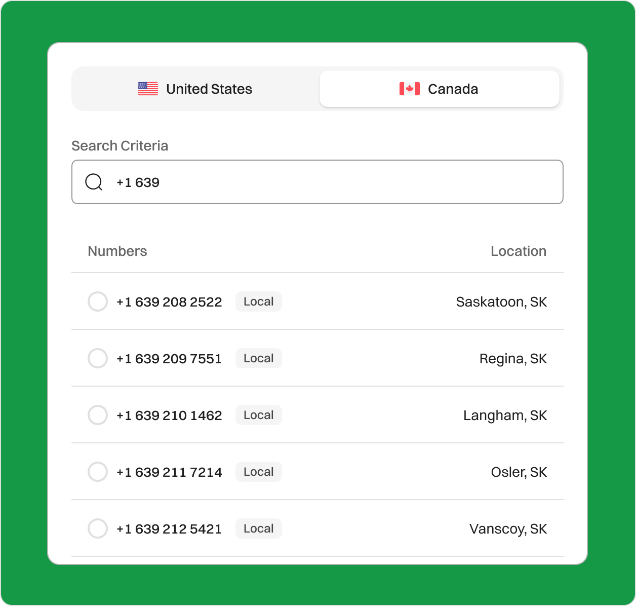 • Choose Canada as your country and search the 639 area code.