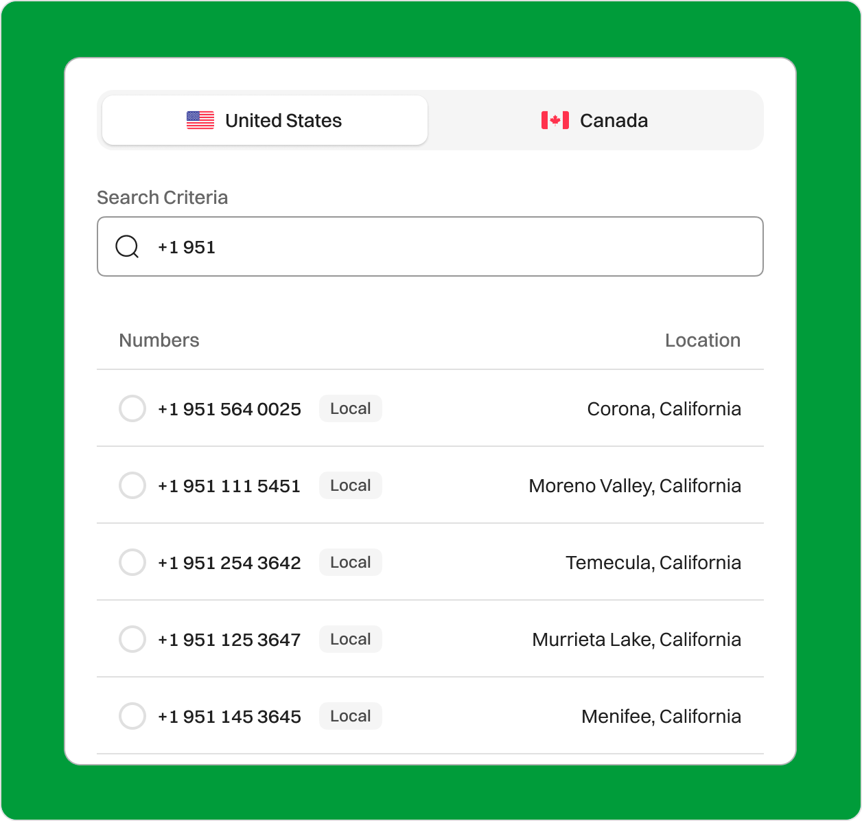 Get 951 Area Code Local Phone Number For Riverside, California Get a 951 area code phone number to establish a strong local presence in Riverside, California. Build trust, boost brand credibility, and align your business with local marketing strategies. A local number increases call response rates and helps customers feel more connected to your company, no matter where you’re based. Sign upRequest a Demo Endorsed by top industry leaders Trusted by industry experts for excellence and innovation. What is the Area Code 951? The 951 area code is a local area code under the North American Numbering Plan. It covers most of Riverside County in Southern California. Cities like Riverside, Moreno Valley, Temecula, and Corona use this code phone system. Other towns include Murrieta, Lake Elsinore, Perris, and Hemet. The 951 phone numbers support local presence for business phones and contact center operations. This area code was created in 2004 from a split with area code 909. It serves the Inland Empire and nearby regions. The 951 area supports local phone communication and unified communications features for businesses. It also enhances customer communications with CRM integrations and call routing systems. Country USA State California Major City Riverside Time Zone Pacific Time Zone (PT) or Pacific Standard Time (PST) Telephone Number Format (951)-XXX-XXXX Example of 951 phone number (951)-231-4321 Zip Code 91752-92883 How to get a 951 Area Code Phone Number? You can purchase a 951 area code phone number from a VoIP service provider like Dialaxy. You can follow these steps. Sign up via the official website or mobile app. Log in with your credentials to access your dashboard. Click the “My Number” option under the “Portal” menu. Select the “Buy Number” option. Choose “US” as the country and select the desired 951 area code from the list. Complete the payment and submit all the necessary documents. How does a 951 business Phone Number work? A 951 business phone number works just like any U.S. number but with the added benefit of giving your business a local identity in Riverside County. Customers in cities like Temecula, Murrieta, and Moreno Valley are more likely to trust and answer calls from a familiar local area code. Whether you’re using mobile, landline, VoIP, or cloud-based phone systems, the 951 area code has you covered. It’s part of the North American Numbering Plan, so it integrates easily with tools your team already uses like CRMs, help desks, and contact center platforms. You also get smart features like call forwarding, team messaging, and CRM integrations to keep your communications sharp. For example, 1-951-231-4321: “1” is the U.S. country code, “951” is Riverside’s local area code, followed by the exchange and subscriber number. Simple, familiar, and local, exactly what your customers expect. Who’s doing business in the 951 area code? The 951 area code is considered home to different businesses that represent a number of industries. Some of the popular companies with an area code 951 include small startups,mid-sized enterprises, and large-scale industries. Different business corporations include Kaiser Permanente, Loma Linda University Medical Center, The United States Marine Corps, The University of California, Riverside, Bourns Inc., Riverside Unified School District, California Baptist University, Riverside Convention Center, and many others. Some of the startups include fitness studios, coffee and boutique shops, and tech startups. Some of Riverside County’s government offices, including the Sheriff’s Department, Department of Public Social Services, and Department of Public Works, are considered government agencies that work under the 951 Area Code. Why Does Your Business Need a 951 Area Code Number? Expand your Presence in Riverside from Anywhere A 951 business phone number helps you create a strong local presence in Riverside County. It connects your business with residents in cities like Corona, Moreno Valley, Temecula, and Murrieta. With a 951 area code, your business appears local, even if you're based outside Southern California. Dialaxy makes it easy to connect with local customers and build credibility. Separate Work and Personal Numbers A dedicated 951 phone number helps keep business and personal communication separate. Protect your privacy by using the 951 number for work. Receive calls and texts on any device. You can turn off work notifications during off-hours. Improve Business Credibility and Trust Using a local area code boosts your company’s image. The 951 area code promotes trust among Riverside customers. Local callers feel more comfortable connecting with familiar numbers. This improves customer response and helps reduce fraud risk. No Special Equipment Needed There’s no need to buy new hardware. Download the Dialaxy app and use your 951 number on any device. It works on phones, tablets, or computers. Get started with what you already use. Integrate With Your Tools Dialaxy supports integration with tools like Slack, Microsoft Teams, and popular CRMs. This saves time, avoids app switching, and improves team collaboration. Advanced Features for Communication Dialaxy includes features like call routing, voicemail-to-email, IVR, shared numbers, and call forwarding. These tools help your team manage customer calls and messages smoothly. Enjoy 100+ Dialaxy’s features with local phone number Call, SMS, & Contact in one easy to use app. Phone Numbers Global Calling SMS Voicemail Number Sharing Contacts All Features Phone Numbers Expand your reach with Virtual Phone Numbers International Numbers: Establish a local presence of your business with our international phone numbers . Toll Free Numbers: Elevate your sales strategy and drive business growth with Toll Free Numbers. Multiple Phone Numbers: Use multiple phone numbers in one single dashboard. Explore our apps Global Calling Connect globally with effortless calls Ex