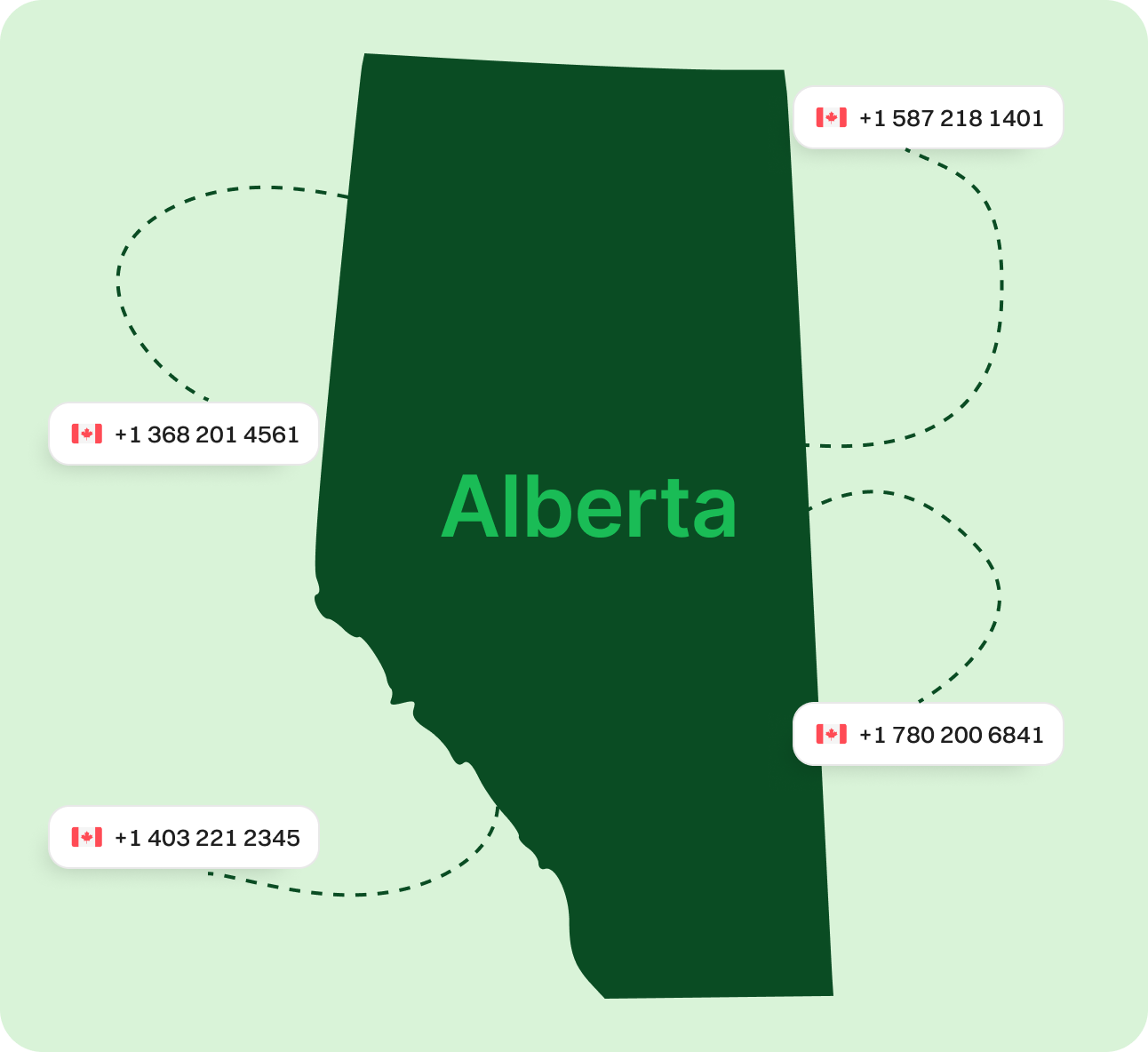 Get an Alberta Virtual Phone Number Today! Secure an Alberta virtual phone number to build a strong local identity and boost customer confidence. Cut down on long-distance charges, streamline your communications, and stay accessible from anywhere—no physical office in Alberta required. Sign upRequest a Demo Endorsed by top industry leaders Trusted by industry experts for excellence and innovation. What is an Alberta Phone Number? An Alberta virtual phone number uses cloud technology to transmit calls over the Internet rather than traditional phone lines. When someone calls your Alberta number, their voice is digitized, sent through the web, and reassembled in real time—delivering smooth, reliable conversations. This modern solution helps businesses handle calls efficiently while enhancing customer experience. Alberta virtual phone numbers eliminate the need for legacy phone hardware and work seamlessly on apps, computers, or dedicated VoIP devices. How Does an Alberta Virtual Phone Number Work? Alberta virtual phone numbers operate through internet-based systems to process calls. When someone dials your number, their voice is converted into data packets, transmitted online, and turned back into audio at the other end. This digital process ensures clear, real-time communication—without the limits of standard phone lines. With this setup, your business can manage calls more flexibly while projecting a professional Alberta presence. Use your Alberta number on mobile apps, VoIP phones, or desktop platforms—no bulky equipment needed. How to Make the Most of Alberta Phone Numbers Make & Receive Calls Send & Receive Texts Keep Work & Personal Separate Establish Local Presence Boost Marketing Efforts Make & Receive Calls Handle customer calls with a local Alberta number to enhance your local appeal. Get Started Send & Receive Texts Communicate via SMS with clients across Alberta for quick, convenient updates. Get Started Keep Work & Personal Separate Use your Alberta number exclusively for business to maintain privacy. Get Started Establish Local Presence Build trust with Alberta customers using a familiar area code, even remotely. Get Started Boost Marketing Efforts Alberta numbers give your campaigns a local edge, increasing response rates. Get Started Specific Area Codes for Alberta Area Code Area Served 368 Newest overlay serving all of Alberta 403 Southern Alberta, including Calgary 587 Province-wide overlay, including Calgary & Edmonton 780 Northern Alberta, including Edmonton 825 Province-wide overlay Why Choose Dialaxy for an Alberta Virtual Phone Number? Flexible Plan Options Multiple pricing tiers tailored to your business or personal needs. Select only the features you require. Quick Setup Process Get started in minutes with a straightforward setup—no hardware or technical expertise necessary. Scalable for Growth Easily add more Alberta numbers as your business expands, ensuring you stay connected. 24/7 Customer Assistance Round-the-clock support for technical issues or general queries—so you’re never left waiting. Advanced Call Tools Access features like voicemail-to-email, call routing, and analytics to boost productivity. Budget-Friendly Pricing Enjoy top-tier service at a competitive price point, with no hidden fees. How to Get an Alberta Number for Your Business Step 1 Create an Account Sign up on the virtual phone number provider’s website using your email or preferred credentials. Step 2 Navigate to "Add New Number" Access your dashboard and select the “Add New Number” option. Step 3 Choose Canada and Select Alberta Select Canada as your country, then pick Alberta and your desired area code. Step 4 Pick Your Alberta Number Browse available Alberta numbers and choose the one that fits your needs. Step 5 Make Payment and Verify Details Complete your purchase and confirm your account information. Step 6 Activate and Start Using Your Number Once activated, your Alberta virtual number is ready for immediate use. Explore More Provinces British Columbia Manitoba New Brunswick Newfoundland Northwest Territories Nova Scotia Nunavut Ontario Prince Edward Island Quebec Saskatchewan Yukon View all Frequently Asked Questions What is an Alberta virtual phone number?It’s a cloud-based virtual number with an Alberta area code, allowing you to make and receive calls online rather than through traditional phone lines. Can I pick a specific Alberta area code?Yes. When registering with Dialaxy, you can choose from available area codes like 403, 587, 780, 825, or 368. Do I have to be in Alberta to use the number?No, you can use your Alberta virtual phone number from anywhere with an internet connection. How much does an Alberta VoIP number cost?Pricing depends on features and the provider. Dialaxy offers affordable plans with no hidden fees. Can I text from my Alberta VoIP number?Yes, most Alberta virtual numbers support SMS for easy customer communication. Is number porting available?Absolutely. You can transfer your existing Alberta number to Dialaxy without hassle.