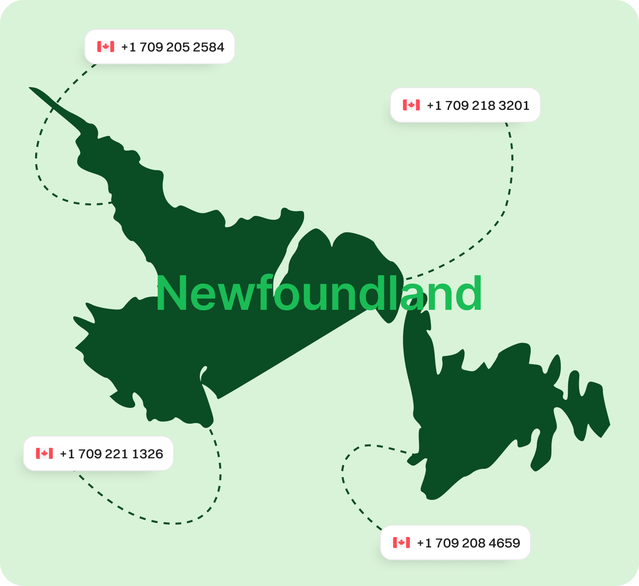 Get a Newfoundland Virtual Phone Number Today! Secure a Newfoundland virtual phone number to connect with local customers and build trust—no physical office required. Eliminate long-distance fees, streamline communication, and stay connected from anywhere using your smartphone, desktop, or VoIP device. Sign upRequest a Demo Endorsed by top industry leaders Trusted by industry experts for excellence and innovation. What Is a Newfoundland Phone Number? A Newfoundland virtual phone number is a cloud-based phone number that uses Voice over Internet Protocol (VoIP) technology. Unlike traditional landlines, it relies on the internet to transmit voice data, allowing for smooth, real-time conversations. This modern solution enables businesses and individuals to establish a strong local presence in Newfoundland while enjoying flexibility, mobility, and professional features. How Does a Newfoundland Virtual Phone Number Work? When someone calls your Newfoundland number, their voice is transformed into data packets. These packets are transmitted over the internet and then reassembled into audio on your device, ensuring reliable and high-quality calls. You can use your virtual number on any internet-enabled device, including a smartphone, computer, or VoIP phone. This gives you the freedom to manage your communication on the go. How to Make the Most of Your Newfoundland Number Make & Receive Calls Send & Receive Texts Keep Work & Personal Separate Establish Local Presence Boost Marketing Efforts Make & Receive Calls Connect with clients using a local Newfoundland number. Get Started Send & Receive Texts Communicate via SMS for updates, promotions, and support. Get Started Keep Work & Personal Separate Keep business communications separate for better organization and privacy. Get Started Establish Local Presence Use a recognizable area code to boost credibility with local customers. Get Started Boost Marketing Efforts Add a local number to your campaigns to increase response rates. Get Started Specific Area Codes for Newfoundland Area Code Region Covered 709 The entire province of Newfoundland and Labrador Why Choose Dialaxy for a Newfoundland Virtual Phone Number? Flexible Plan Options Pick from a variety of pricing tiers tailored to fit both personal and business needs. You only pay for the features you actually use—no extras, no waste. Quick Setup Get your Newfoundland virtual phone number up and running within minutes. No tech skills or hardware required—just a few simple steps. Scalable for Growth As your business expands, you can easily scale by adding more Newfoundland numbers. Stay organized while maintaining a strong local presence 24/7 Customer Support Have a question or issue? Our support team is available around the clock to ensure you’re never left in the dark. Advanced Features Enjoy powerful tools designed to streamline communication, such as voicemail-to-email, intelligent call routing, call forwarding, analytics, and more. Affordable Pricing Access premium virtual phone services at budget-friendly rates. No contracts, no hidden charges—just transparent pricing. How to Get a Newfoundland Number for Your Business Step 1 Create an Account Sign up on the virtual phone number provider’s website using your email or preferred credentials. Step 2 Navigate to "Add New Number" Please log in to your dashboard and choose the option to "Add New Number." Step 3 Choose Canada and Select Newfoundland Choose Canada as your country, then select Newfoundland and your preferred area code. Step 4 Pick Your Newfoundland Number Explore the available Newfoundland numbers and select the one that best meets your needs. Step 5 Make Payment and Verify Details Complete your purchase confidently and verify your account information. Step 6 Activate and Start Using Your Number Once activated, your Newfoundland virtual number is ready for immediate use. Explore More Provinces Alberta British Columbia Manitoba New Brunswick Northwest Territories Nova Scotia Nunavut Ontario Prince Edward Island Quebec Saskatchewan Yukon View all Frequently Asked Questions What is a Newfoundland virtual phone number?It’s a cloud-based number with the 709 area code, allowing you to make and receive calls over the internet. Can I choose the 709 area code?Yes! Dialaxy lets you choose the 709 area code when selecting your virtual number. Do I need to be in Newfoundland to use the number?No. You can use your Newfoundland virtual number from anywhere in the world with an internet connection. Can I send texts from my Newfoundland number?Absolutely. Most Newfoundland virtual numbers support two-way SMS for smooth communication. Is number porting available?Yes, you can transfer your existing Newfoundland number to Dialaxy easily. How much does it cost?Pricing depends on your plan and features. Dialaxy offers affordable, transparent options with no hidden fees.