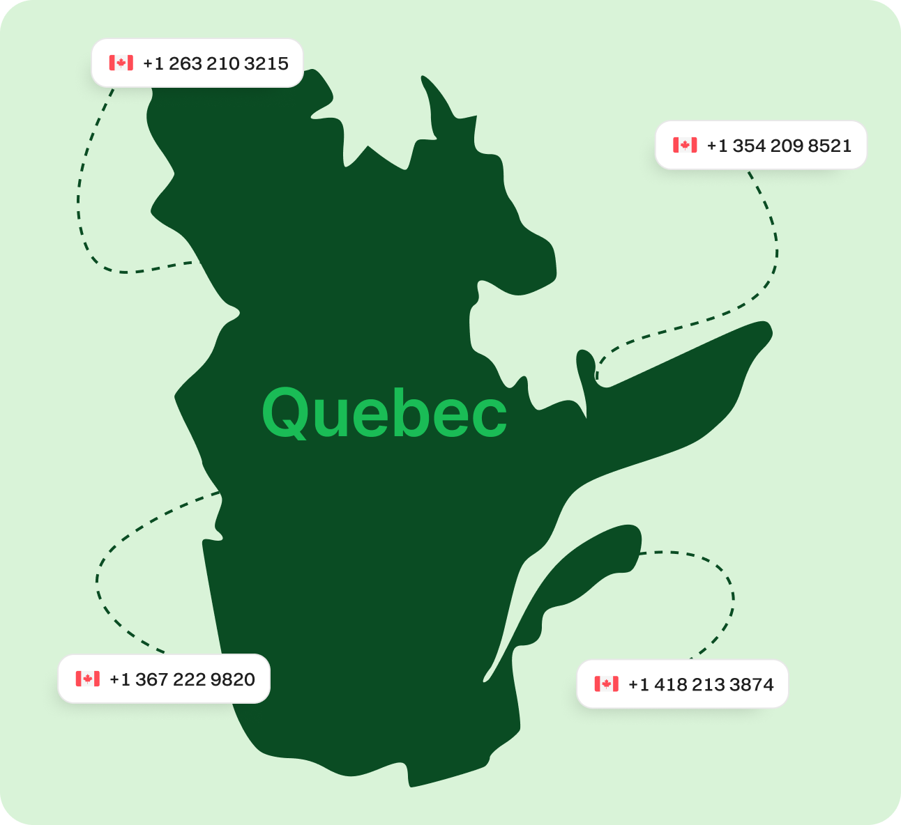 Get a Quebec Virtual Phone Number Today! Secure a Quebec virtual phone number to establish a strong local presence and increase customer confidence across the province. Reduce long-distance charges, improve accessibility, and stay connected from anywhere, without needing a physical office in Quebec. Sign upRequest a Demo Endorsed by top industry leaders Trusted by industry experts for excellence and innovation. What is a Quebec Phone Number? A Quebec virtual phone number is a cloud-based number that uses the internet (VoIP) technology instead of traditional phone lines. When someone calls your Quebec number, the call is digitized, sent through the internet, and reconstructed in real time, ensuring smooth, reliable conversations. These numbers allow businesses to operate efficiently while offering excellent customer service. With a virtual number, there’s no need for physical phone infrastructure. Calls can be answered through mobile apps, desktop software, or VoIP phones, giving your business the flexibility to work from anywhere. How Does a Quebec Virtual Phone Number Work? Quebec virtual phone numbers operate through cloud telephony systems. When a customer calls your number, their voice is converted into digital packets, transmitted over the internet, and turned back into audio at the receiving end. This technology allows for crystal-clear, real-time communication from any device with an internet connection. You can use your Quebec number on mobile apps, laptops, VoIP phones, or other connected devices. This setup gives your business a professional Quebec presence—without the need for a physical office in the province. How to Make the Most of Quebec Phone Numbers Make & Receive Calls Send & Receive Texts Keep Work & Personal Separate Establish Local Presence Boost Marketing Efforts Make & Receive Calls Use a local Quebec number to connect with customers and make your business feel more accessible. Get Started Send & Receive Texts Communicate with clients across Quebec via SMS for fast, responsive interactions. Get Started Keep Work & Personal Separate Use your Quebec number for business only, helping you manage calls and messages more efficiently. Get Started Establish Local Presence Build credibility in Quebec with a recognizable local area code, even if you're located elsewhere. Get Started Boost Marketing Efforts Local Quebec numbers make your marketing campaigns feel more personal and relevant to local audiences. Get Started Specific Area Codes for Quebec Area Code Region Covered 263 Overlay for area code 418, serving eastern Quebec 354 Overlay for area code 450, covering southern Quebec including Montreal suburbs 367 Overlay for area code 418, serving eastern Quebec including Quebec City 418 Eastern Quebec, including Quebec City 438 Overlay for 514, covering Montreal and surrounding areas 450 Surrounding areas of Montreal, including Laval, Longueuil, and the South Shore 468 New overlay for 418, 581, and 367 in eastern Quebec 514 Covers the island of Montreal 579 Overlay for 450, covering Montreal's suburban regions 581 Overlay for 418, serving eastern Quebec 819 Western and northern Quebec, including Gatineau, Sherbrooke, and Trois-Rivières 873 Overlay for 819, covering the same western and northern Quebec areas Why Choose a Quebec Virtual Phone Number Provider? Flexible Plan Options Choose from multiple plans based on your business size and call volume. Quick Setup Process Activate your Quebec number in just minutes—no hardware required. Scalable for Growth Add more Quebec numbers as your business expands. 24/7 Customer Support Get technical help or account assistance whenever you need it. Advanced Features Voicemail-to-email, call forwarding, analytics, IVR, and more to streamline operations. Affordable Pricing Enjoy cost-effective VoIP solutions with transparent billing and no hidden charges. How to Get a Quebec Number for Your Business Step 1 Create an Account Sign up on the virtual phone number provider’s website using your email or preferred credentials. Step 2 Navigate to "Add New Number" Access your dashboard and select the “Add New Number” option. Step 3 Choose Canada and Select Quebec Select Canada as your country, then pick Quebec and your desired area code. Step 4 Pick Your Quebec Number Browse available Quebec numbers and choose the one that fits your needs. Step 5 Make Payment and Verify Details Complete your purchase and confirm your account information. Step 6 Activate and Start Using Your Number Once activated, your Quebec virtual number is ready for immediate use. Explore More Provinces Alberta British Columbia Manitoba New Brunswick Newfoundland Nova Scotia Northwest Territories Nunavut Ontario Prince Edward Island Saskatchewan Yukon View all Frequently Asked Questions What is a Quebec virtual phone number?A Quebec virtual phone number is a cloud-based number with a local area code (such as 514, 418, or 450) that allows you to make and receive calls over the internet. Can I choose a specific Quebec area code?Yes, most providers let you select from available Quebec area codes, including 514, 418, 450, 819, and overlays like 581, 438, and 873. Do I need to be in Quebec to use the number?No, you can use your Quebec number from anywhere in the world as long as you have an internet connection. How much does a Quebec VoIP number cost?Costs vary depending on the provider and features, but most offer affordable plans with no hidden fees. Can I text using my Quebec number?Yes, many Quebec virtual numbers support SMS for business texting. Is number porting available?Yes, most providers support number porting, so you can transfer your existing Quebec number to their platform.