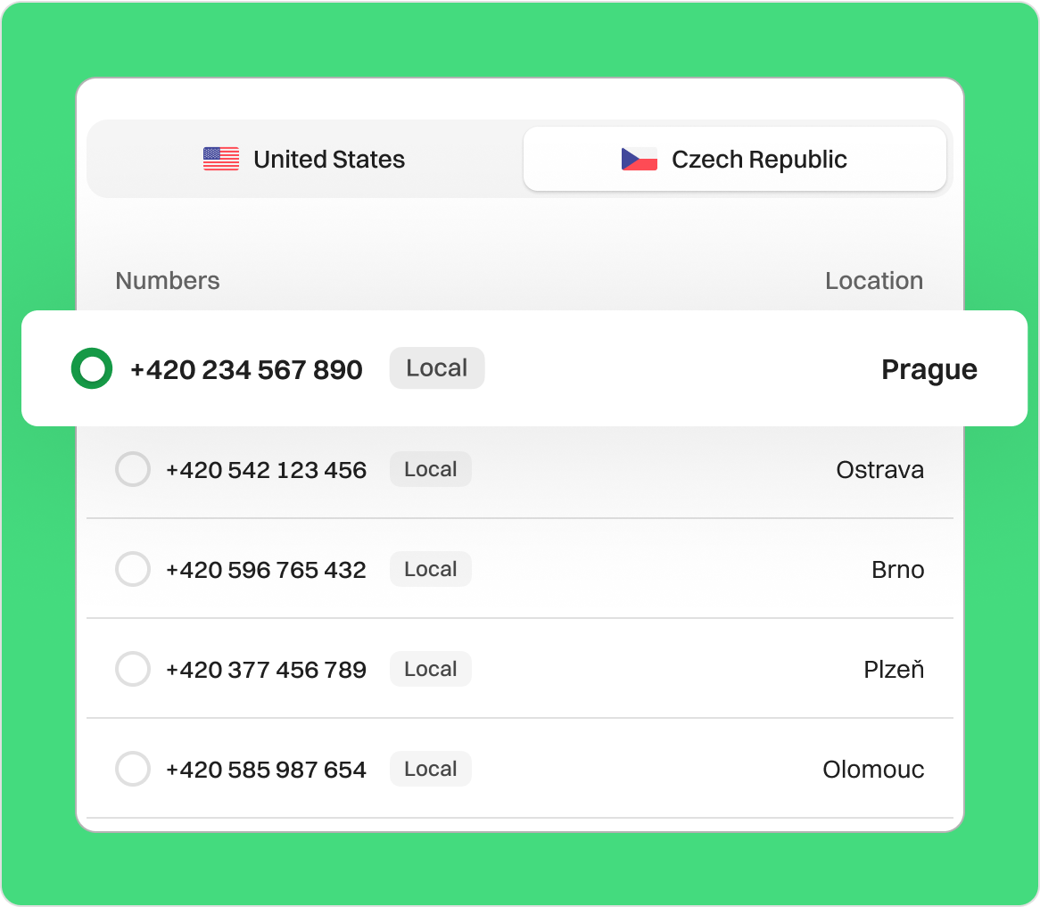 Get an Czech Republic Virtual Number Do you need a business phone number in the Czech Republic? As digital communication becomes the norm, now’s the right time to go virtual. A free Czech Republic virtual phone number is a wise choice for both personal and professional needs. Sign up via the provider's website or mobile app. Instantly manage, forward, and monitor your incoming calls. Forward calls to your mobile, landline, or desktop device worldwide. Sign upRequest a Demo Endorsed by top industry leaders Trusted by industry experts for excellence and innovation. How to Buy a Czech Republic Virtual Number from Dialaxy? Getting a virtual number in the Czech Republic is easy with Dialaxy. They are a trusted VoIP provider that offers cloud phone solutions worldwide. You don’t need local paperwork or a Czech SIM card. To set up your number in minutes, simply follow these steps: Create an account on the official site or app. Sign up via the official website or mobile app. Log in with your credentials to access the dashboard. Click the “My Number” option under the “Portal” menu. Select the “Buy Number” option. Choose “Czech Republic” as the country and select the desired Israel area code from the list. Complete your payment and upload any required identification documents. What is the Czech Republic Virtual Phone Number? A Czech virtual phone number appears to be a local mobile or landline number. However, it works through the internet, not a regular phone line. It’s cloud-based and doesn’t require a physical SIM or location. It uses VoIP technology. This lets users make calls or send texts from their mobile phones, computers, or tablets, no matter where they are. The number follows the Czech phone format. It starts with +420, which is the country code for the Czech Republic. Then, it has a 9-digit number that can change based on the region. How Does a Czech Republic Phone Number Work? When someone calls your Czech virtual phone number, the call is routed over the internet. It does not use traditional phone lines. Your voice is changed into digital data. It is sent over a secure network. When it reaches the recipient, it is converted back into audio. This process happens in real-time and is powered by VoIP technology. It makes your virtual number sound and work just like a real Czech landline or mobile number. No delays. No dropped calls. Just crystal-clear communication. You can receive and make calls, as well as send SMS and MMS messages, through supported apps, depending on your plan. Additionally, you can forward calls to your personal number in another country, without the caller being aware. Why Buy Local Czech Republic Phone Numbers from Dialaxy? Quick and Easy Setup Need a Czech business number fast? With Dialaxy, you can get started in just minutes. No hardware, no local registration, and no waiting time. Simply sign up, select your area, and your number will go live. Make Calls Appear Local When you call customers in the Czech Republic, your number appears local. This builds instant trust and increases the likelihood that your call will be answered. It also improves your response rate if you're running local campaigns. Fast and Flexible Number Selection Dialaxy offers numerous area codes for major Czech cities. This includes Prague (2xx), Brno (5xx), and Ostrava (5xx). You can even get vanity numbers that match your brand or choose multiple numbers for different departments or teams. Share and Use Instantly Once your Czech number is activated, you can share it with customers, add it to your website, or include it in email signatures. People can call, text, or leave voicemails—all of which can be forwarded to your preferred device. Budget-Friendly Plans Need a number without burning a hole in your pocket? Dialaxy offers Czech Republic virtual numbers starting from just $10 /month. Plans include call forwarding, voicemail, SMS, and more, without setup fees or long-term contracts. Build Local Presence and Trust Having a Czech number improves local visibility and helps customers feel more comfortable calling or answering your business. It also supports local marketing strategies by allowing you to target specific regions and track performance. Enjoy 100+ Dialaxy’s features with local phone number Call, SMS, & Contact in one easy to use app. Phone Numbers Global Calling SMS Voicemail Number Sharing Contacts All Features Phone Numbers Expand your reach with Virtual Phone Numbers International Numbers: Establish a local presence of your business with our international phone numbers . Toll Free Numbers: Elevate your sales strategy and drive business growth with Toll Free Numbers. Multiple Phone Numbers: Use multiple phone numbers in one single dashboard. Learn More Global Calling Connect globally with effortless calls Extended Reach: Enables businesses to expand their market by reaching international customers. Flexibility: Allows employees to make international calls from anywhere. Seamless Communication: Ensures clear and reliable communication with international contacts. Learn More SMS Enhance communication with SMS capabilities A2P 10DLC: Register your number in A2P 10DLC to send sms within US and Canada. Schedule SMS: Schedule SMS as per your customer timezone so they don’t miss an update. Personalised Messaging: Personalise SMS depending upon your user and its behaviour. Learn More Voicemail Easily manage messages with Voicemail Voicemail Recording: Personalized voicemail greetings for different departments Message Management: Messages are stored in the cloud, allowing for easy access. Access and Playback: Listen to voicemails from any internet-connected device. Learn More Number Sharing Enhance collaboration with effortless Number Sharing Unified communication: With number sharing, multiple devices can use the same phone number. Convenience: Seamlessly switch between devices without missing calls or texts. Cost Efficiency: Reduce costs by eliminating the