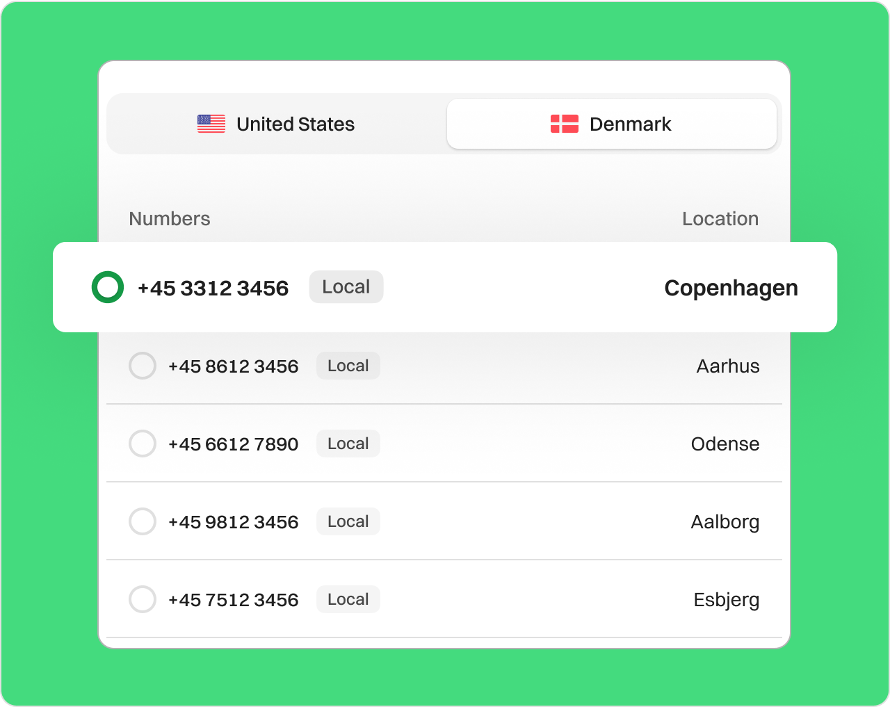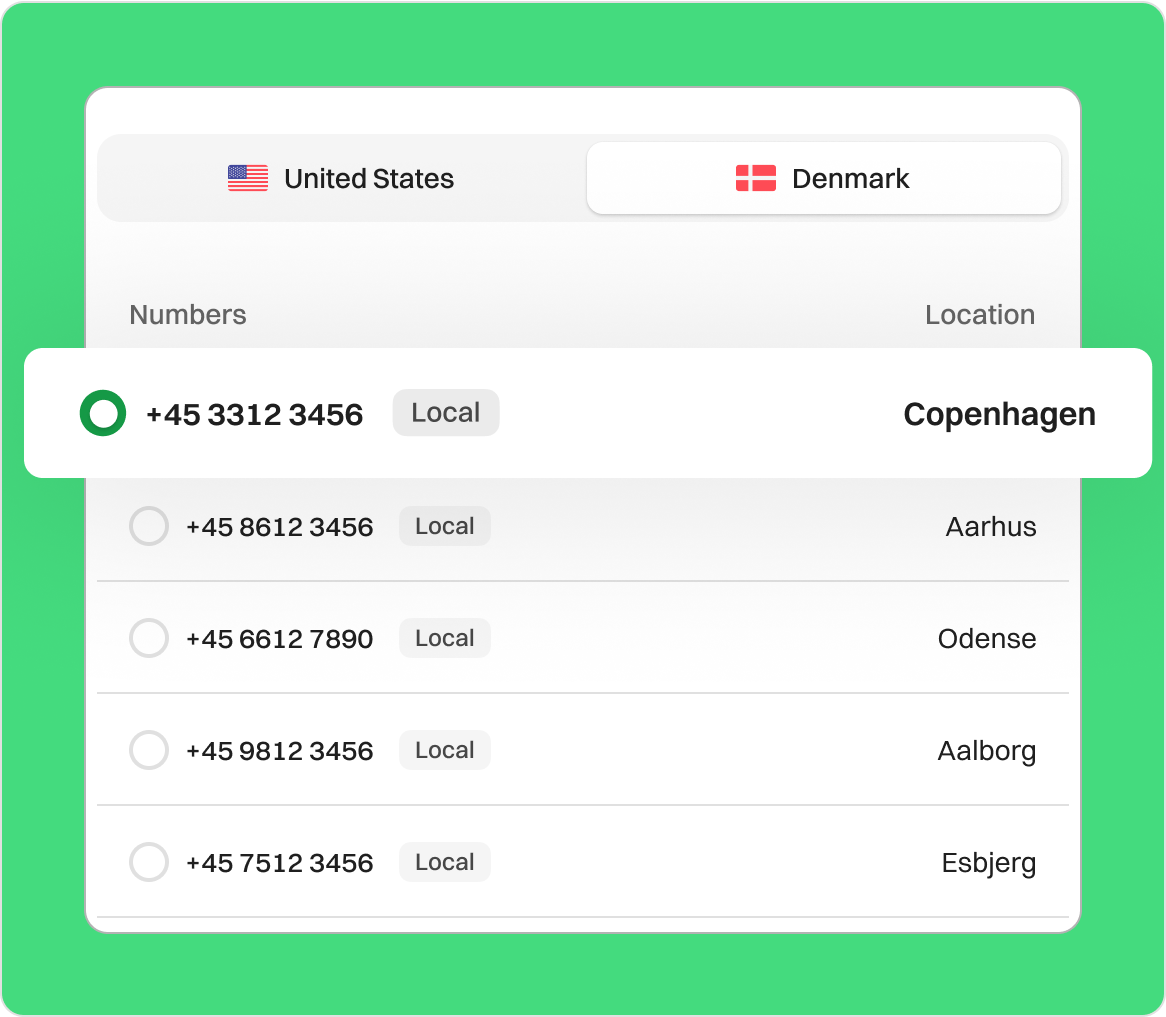 Get a Denmark Virtual Number Need a business or personal phone number in Denmark? As communication rapidly shifts to online platforms, a Danish virtual phone number is a smart, modern solution for anyone looking to establish a presence in Denmark, whether for business, travel, or personal use. Register through the official website or mobile app. Monitor, record, and manage incoming calls instantly. Forward calls to any device worldwide, ensuring you never miss a connection. Sign upRequest a Demo Endorsed by top industry leaders Trusted by industry experts for excellence and innovation. How to buy a Denmark Virtual Number from Dialaxy? Getting a Denmark virtual phone number is quick and easy with trusted VoIP providers like Dialaxy. It is a trusted service provider for obtaining Denmark virtual numbers. To get one, follow the given steps: Sign up via the official website or mobile app. Log in with your credentials to access the dashboard. Click the “My Number” option under the “Portal” menu. Select the “Buy Number” option. Choose “Denmark” as the country and select the desired Denmark area code from the list. Complete your payment and upload any required identification documents. What is the Denmark Virtual Phone Number? The Denmark virtual phone number is a cloud-based number that appears to be a regular mobile or landline phone number but is not associated with any physical address or conventional phone line. This technology utilizes VoIP, enabling individuals to send and receive calls and messages over the internet from their Danish number on internet-enabled devices, such as mobile phones, desktops, and laptops, without requiring SIM cards. It has the same general configuration as other ordinary Danish phone numbers, comprising 8 digits, typically starting with a country code of +45 (the international code), followed by an 8-digit subscriber number with no area code. How does a Denmark phone number work? Virtual numbers for Denmark eliminate the need for physical hardware, relying only on a stable internet connection. When someone dials your Denmark virtual number, their voice is transformed into digital data packets. These packets then securely navigate the internet, reaching your chosen device. Upon arrival, the data is converted back into audio, enabling real-time conversations just like a traditional call. You can use your virtual number on any compatible device and even forward calls to your current mobile or landline number, regardless of your location worldwide. Why buy local Denmark phone numbers from Dialaxy? Simple way to get a Denmark phone number Looking to set up a Denmark phone number for business or personal reasons? Dialaxy makes it fast and easy. You can keep your handset, select a region, and enjoy basic features. Join up today and begin in a few minutes. Your contacts can make local phone calls With a local virtual number from Denmark, you can ensure that your phone calls always appear to be originating from within the country. In this way, it helps to build trust with Danish clients, friends, or family, thereby establishing your local presence. A Rapid Number Selection Method Unlock local calls with a Denmark virtual number. Select your country and region, and pick a number that suits your needs. You can even effortlessly get a vanity number or multiple numbers. Share the number with those you know Once activated, you can instantly share your new Danish phone number with anyone. They can call, leave a voice message, or send an SMS/MMS right away. Your number connects directly to your handset for an easy transition. Cost-effective virtual numbers for Denmark Looking for affordable global virtual numbers? You're in luck! We offer a variety of virtual numbers at budget-friendly rates. For example, you can get a Danish number for SMS and voice calls for as low as $20 per month. Local Presence and Customer Trust Acquiring local Danish phone numbers strengthens business presence, builds customer trust, and enables targeted marketing. This helps improve campaign tracking and engagement in specific regions. Enjoy 100+ Dialaxy’s features with local phone number Call, SMS, & Contact in one easy to use app. Phone Numbers Global Calling SMS Voicemail Number Sharing Contacts All Features Phone Numbers Expand your reach with Virtual Phone Numbers International Numbers: Establish a local presence of your business with our international phone numbers . Toll Free Numbers: Elevate your sales strategy and drive business growth with Toll Free Numbers. Multiple Phone Numbers: Use multiple phone numbers in one single dashboard. Learn More Global Calling Connect globally with effortless calls Extended Reach: Enables businesses to expand their market by reaching international customers. Flexibility: Allows employees to make international calls from anywhere. Seamless Communication: Ensures clear and reliable communication with international contacts. Learn More SMS Enhance communication with SMS capabilities A2P 10DLC: Register your number in A2P 10DLC to send sms within US and Canada. Schedule SMS: Schedule SMS as per your customer timezone so they don’t miss an update. Personalised Messaging: Personalise SMS depending upon your user and its behaviour. Learn More Voicemail Easily manage messages with Voicemail Voicemail Recording: Personalized voicemail greetings for different departments Message Management: Messages are stored in the cloud, allowing for easy access. Access and Playback: Listen to voicemails from any internet-connected device. Learn More Number Sharing Enhance collaboration with effortless Number Sharing Unified communication: With number sharing, multiple devices can use the same phone number. Convenience: Seamlessly switch between devices without missing calls or texts. Cost Efficiency: Reduce costs by eliminating the need for multiple phone plans. Learn More Contacts Effortlessly manage your contacts Add and delete contact: Add and delete new conta