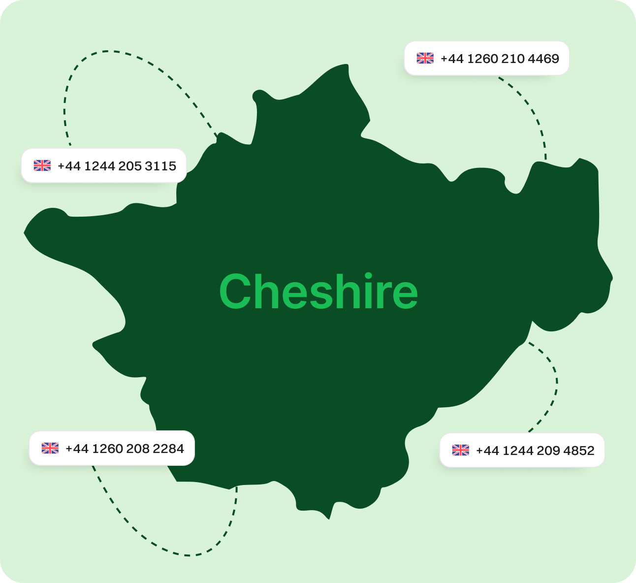 Get Your Cheshire Virtual Phone Number Today! Give your business a local voice with a number that feels familiar to your customers. Build your local presence in Cheshire, covering towns like Congleton, Chester, and Warrington. A Cheshire virtual phone number helps you connect with customers, manage calls easily, and sound more local, even if you’re working from anywhere in the UK. Sign upRequest a Demo Endorsed by top industry leaders Trusted by industry experts for excellence and innovation. What Is a Cheshire Phone Number? A Cheshire virtual phone number is a cloud-based number that uses VoIP (Voice over Internet Protocol). Instead of relying on landlines, it lets you make and receive business calls through the internet. You can serve customers in Cheshire and nearby areas like Staffordshire, Greater Manchester, and Merseyside. No need for a physical office. Your team can take incoming calls from anywhere while appearing local to your customers. How Does a Cheshire Virtual Phone Number Work? Cheshire virtual numbers run on cloud phone systems. When someone calls your local area code, the call is sent over the internet to your chosen device. It can ring on your mobile, laptop, VoIP phone, or desktop. The system converts voices into digital data. This means clear, fast communication with no traditional phone lines required. You can forward calls, manage outbound calls, and use voicemail, all in one platform. What Can You Do With Cheshire Phone Numbers? Make & Receive Calls Send & Receive Texts Separate Work & Personal Establish Local Presence Boost Marketing Efforts Make & Receive Calls Stay connected across Cheshire’s main towns and business areas. Get Started Send & Receive Texts Engage customers in Congleton, Chester, and surrounding areas via SMS. Get Started Separate Work & Personal Keep communications distinct; ideal for remote teams or freelancers. Get Started Establish Local Presence Use local Chester or Congleton numbers to build trust, even if based elsewhere. Get Started Boost Marketing Efforts Improve campaign response rates in key economic zones with local numbers. Get Started More Ways Dialaxy Supports Your UK Business Better Engagement Customers are more likely to respond to calls from a local area code. A Cheshire number improves call pickup rates and shows that you’re part of the local community. UK-Wide Coverage Whether you’re expanding into Manchester, Liverpool, Birmingham, or beyond, you can add multiple local numbers to support your growth strategy across the UK. Keep Your Number Already using a local number in Cheshire? No problem. Easily port your number to Dialaxy and keep all your contacts without disruption. Business Tools Access advanced features like call forwarding, voicemail-to-email, call analytics, auto attendants, and more. Everything is managed from a single cloud phone system. CRM Integration Seamlessly connect your virtual number with your CRM system. Log customer interactions, manage leads, and track communication history to build stronger relationships and close more deals efficiently. Specific Area Codes for Cheshire Area Code Region Covered 01244 Chester and the surrounding areas 01260 Congleton and several surrounding areas in Cheshire East Why Choose Dialaxy for Your Cheshire Virtual Phone Number? Flexible Plans Ideal for small teams, large enterprises, and contact centers. Only pay for what you need. Quick Setup Choose a local area code (e.g., 01244 for Chester, 01260 for Congleton) and activate your number in minutess. Scalable for Growth Add more numbers as you expand across Cheshire or into Greater Manchester, Staffordshire, and Merseyside. 24/7 Customer Assistance Always-on support, even for teams working late or across time zones. Advanced Call Tools Get call forwarding, voicemail-to-email, auto attendants, and analytics, all in one platform. Affordable Pricing Build a professional presence in Cheshire without breaking your budget. How to Get a Cheshire Number with Dialaxy Step 1 Create an Account Visit the Dialaxy website and create your account using your business or personal email address. This gives you access to the communications dashboard. Step 2 Go to "Add New Number" Once logged in, navigate to your user dashboard and click on "Add New Number." Step 3 Select UK > Cheshire Choose the United Kingdom as your country, then select Cheshire as your target region. Step 4 Pick Your Area Code Choose a local area code, such as 01244 for Chester or 01260 for Congleton. Step 5 Pay & Verify Secure your number by completing the payment and identity verification process. Everything is protected and streamlined. Step 6 Start Calling Your number is ready! Start making and receiving both incoming calls and outbound calls from your cloud phone system. Grow Your Business with a Cheshire Area Code Great Location Cheshire sits between Manchester, Liverpool, and North Wales. This central positioning makes it a prime location for reaching both urban and rural UK customers with ease. Having a Cheshire virtual number allows your business to be everywhere at once without ever leaving your desk. Trusted by Locals Customers are more likely to answer business calls when they see a familiar area code. A local number builds customer trust, boosts pickup rates, and makes your outreach efforts more successful. Good for Any Industry Whether you work in tech, healthcare, logistics, education, or tourism, a virtual number with a Cheshire area code supports professional communication across industries. It helps you maintain a consistent, reliable image no matter your sector. Remote-Ready Working remotely? No problem. Use your number from anywhere in the world and still appear to be based right in Cheshire. It’s a perfect solution for remote teams, freelancers, and digital businesses. Cost-Effective Skip the cost of physical office space and use your virtual number to reach customers throughout the region. It’s a low-cost way to scale up without scaling you