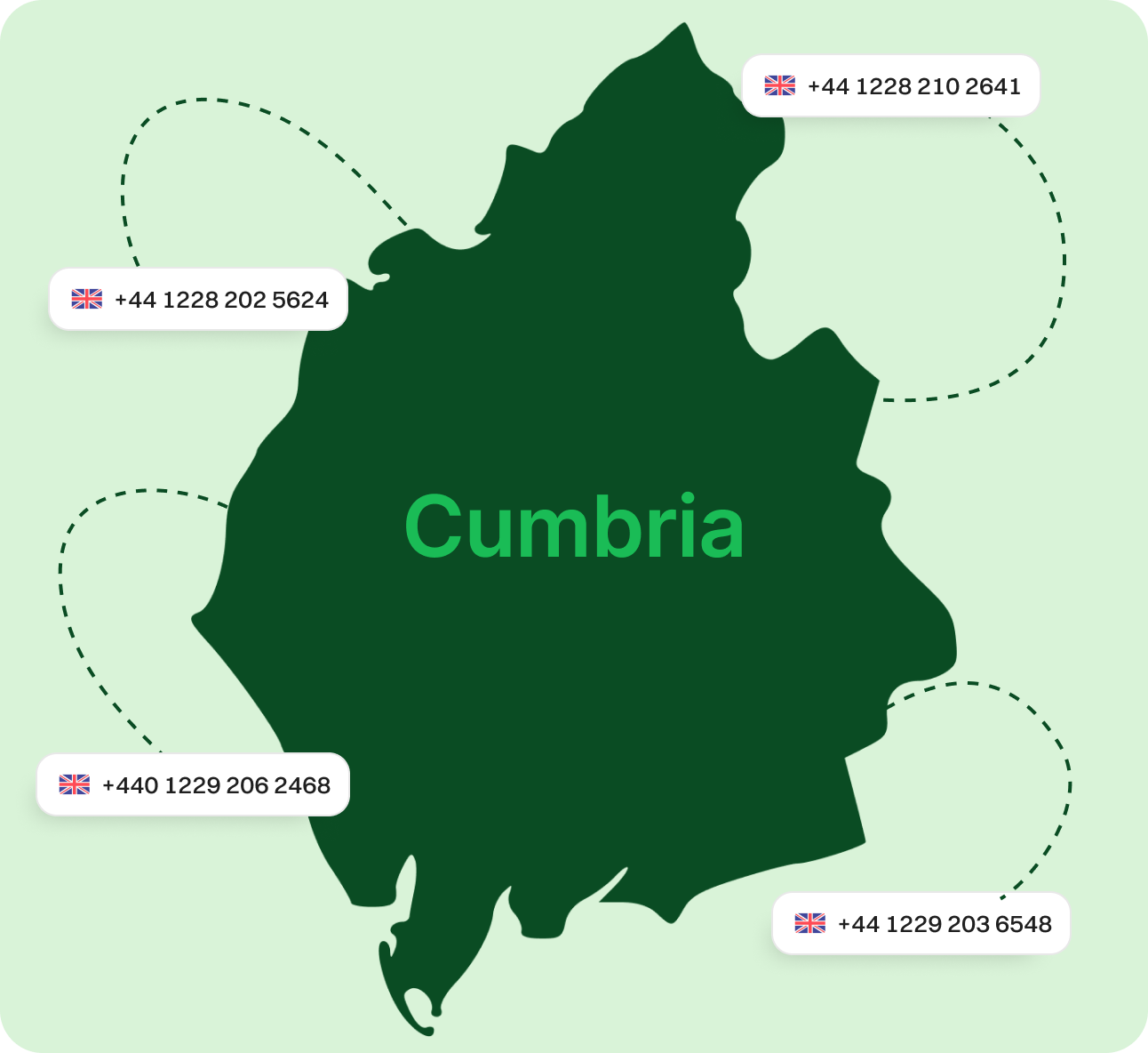Get Your Cumbria Virtual Phone Number Today! Build a trusted local presence in Cumbria, covering towns like Carlisle and Barrow-in-Furness. A Cumbria virtual phone number helps you reach UK customers, avoid long-distance costs, and operate without a physical office. Sign upRequest a Demo Endorsed by top industry leaders Trusted by industry experts for excellence and innovation. What Is a Cumbria Phone Number? A Cumbria virtual phone number uses VoIP (Voice over Internet Protocol) to send voice over the internet instead of landlines. Make and receive calls from anyplace while maintaining a local identity. It’s reliable, clear, and ideal for staying connected. Perfect for companies serving Northern England and the Scottish border regions, this number supports flexible operations and keeps you close to your customers. How Does a Cumbria Virtual Phone Number Work? Cumbria virtual numbers use VoIP technology to route calls through your internet connection. When a customer dials your number, their voice is turned into data packets instantly. You get stable communication, with little delay, whether you’re in Cumbria or working remotely. Calls can go to your mobile, desktop, or VoIP phone, making it ideal for local teams or remote staff targeting Carlisle or Barrow-in-Furness. What Can You Do With Cumbria Phone Numbers? Make & Receive Calls Send & Receive Texts Separate Work & Personal Establish Local Presence Boost Marketing Efforts Make & Receive Calls Stay connected across Cumbria’s business districts and rural zones. Get Started Send & Receive Texts Message customers in Carlisle, Barrow, or Windermere through SMS. Get Started Separate Work & Personal Keep work calls separate from personal ones—ideal for small teams or freelancer Get Started Establish Local Presence Use familiar codes like 01228 (Carlisle) or 01229 (Barrow) to build regional trust. Get Started Boost Marketing Efforts Improve outreach with numbers based in Cumbria’s recognised area codes. Get Started More Ways Dialaxy Supports Your UK Business Improved Customer Engagement Cumbrian numbers encourage higher response rates and customer trust. Nationwide UK Coverage Add numbers for surrounding regions like Lancashire, Northumberland, or Dumfries. Effortless Number Portability Keep your existing number by transferring to Dialaxy with no hassle. Industry-Specific Tools Support for tourism, agriculture, education, and more across Cumbria. Brand Consistency Use the same Cumbria number across all channels for a unified business identity. Specific Area Codes for Cumbria Area Code Region Covered 01228 Carlisle and the surrounding areas 01229 Barrow-in-Furness and southern Cumbria Why Choose Dialaxy for Your Cumbria Virtual Phone Number? Flexible Plans Great for startups, remote teams, and larger businesses. Quick Setup Choose a code (e.g., 01228 for Carlisle) and get started in minutes. Scalable for Growth Add more numbers as your coverage expands through Northern England. 24/7 Support Help available day or night—ideal for seasonal or round-the-clock businesses. Advanced Call Tools Use voicemail-to-email, call forwarding, analytics, and more. Affordable Pricing Get UK-wide reach without going over budget. How to Get a Cumbria Number with Dialaxy? Step 1 Create an Account Register on Dialaxy using your business or personal email. Step 2 Go to "Add New Number" Access your unified communications dashboard and select this option. Step 3 Choose United Kingdom > Cumbria Pick your region and city (like Carlisle). Step 4 Pick Your Area Code Select from 01228 or 01229 depending on your preferred location. Step 5 Make Payment and Verify Complete your order and identity verification. Step 6 Activate and Use Start using your Cumbria number on mobile, VoIP, or desktop in just minutes. Grow Your Business with a Cumbria Area Code Strategic Location Cumbria borders Scotland and lies close to major routes like the M6. Local codes such as 01228 (Carlisle) offer access to this strategic northern gateway. Industry Versatility With strengths in tourism, renewable energy, and food production, a Cumbria number gives your business local credibility. Market Expansion Appear local in key towns like Carlisle or Barrow-in-Furness—even if based elsewhere. Local numbers improve customer response rates. Reliable Connectivity VoIP systems provide dependable service across rural and urban Cumbria from any device. Business-Friendly Region Cumbria supports growth in clean energy, logistics, and education—ideal for businesses building regional roots. Startup Ready Freelancers and small businesses can use a Cumbria number for professionalism without needing an office. Explore More UK Regions Somerset Cheshire Scottish Borders Kent Hampshire Devon Surrey Essex South Yorkshire View all Frequently Asked Questions What is a Cumbria virtual phone number?It’s a VoIP-powered number tied to Cumbria codes like 01228 (Carlisle) or 01229 (Barrow). Can I choose a specific Cumbria area code?Yes, you can select from all available local codes during setup. Do I need to be based in Cumbria to use it?Not at all. Use it from anywhere—ideal for remote teams or nationwide businesses. Can I send SMS using the Cumbria number?Yes, most plans support sending and receiving SMS. Can I transfer my current number?Yes, number porting is simple and helps you keep your current customer base. How much does it cost?Dialaxy offers affordable plans for teams working across Cumbria, whether seasonal or permanent.