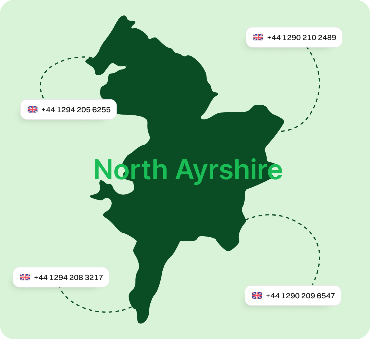 Get Your North Ayrshire Virtual Phone Number Today! Establish a strong local presence across North Ayrshire, including key towns such as Irvine, Kilwinning, and Cumnock. A virtual phone number enhances customer trust, eliminates long-distance charges, and connects your business to Scottish customers without the need for a physical office in the region. Sign upRequest a Demo Endorsed by top industry leaders Trusted by industry experts for excellence and innovation. What Is a North Ayrshire Phone Number? A North Ayrshire virtual phone number uses VoIP (Voice over Internet Protocol) technology to transmit calls over the internet. This means you can communicate from anywhere, without relying on traditional landlines. It’s a smart solution for businesses that want to stay connected to North Ayrshire even if they operate remotely. This tool is ideal for companies serving the west of Scotland and its surrounding areas, including Glasgow, Renfrewshire, and South Ayrshire. A virtual number enhances your operational flexibility while creating a trusted local identity. How Does a North Ayrshire Virtual Phone Number Work? North Ayrshire virtual numbers work through internet-based VoIP systems. When someone dials your number, their voice is instantly turned into digital packets and routed online over the internet. This ensures crystal-clear communication with minimal delay, whether you’re based in Irvine or operating from another city, offering flexibility. You can forward calls to mobile phones, VoIP handsets, or desktops. This makes virtual numbers ideal for call centres, remote teams, and businesses wanting a presence in North Ayrshire’s most vibrant locations, such as Ardrossan and Saltcoats. What Can You Do With North Ayrshire Phone Numbers? Make & Receive Calls Send & Receive Texts Separate Work & Personal Establish Local Presence Boost Marketing Efforts Make & Receive Calls Stay connected with customers in Irvine, Kilwinning, and beyond. Get Started Send & Receive Texts Communicate through SMS with local customers in real time. Get Started Separate Work & Personal Keep professional communications separate from personal calls. Get Started Establish Local Presence Build credibility by using a recognisable North Ayrshire area code. Get Started Boost Marketing Efforts Improve response rates with locally targeted marketing campaigns. Get Started More Ways Dialaxy Supports Your UK Business Improved Customer Engagement North Ayrshire numbers increase pick-up and response rates. Nationwide UK Coverage Expand into nearby areas like Glasgow, Paisley, and East Ayrshire. Effortless Number Portability Easily bring your existing number from Irvine or Cumnock to Dialaxy. Industry-Specific Tools Support for sectors like tourism, manufacturing, retail, and renewable energy. Consistent Brand Identity Keep a professional image with a caller ID tied to your chosen area code. Specific Area Codes for North Ayrshire Area Code Region Covered 01294 Irvine, Kilwinning, Saltcoats 01290 Cumnock and its surrounding villages Why Choose Dialaxy for Your North Ayrshire Virtual Phone Number? Flexible Plans Tailored options for small businesses, large enterprises, and call centres. Pay only for what you need. Quick Setup Choose 01294 (Irvine) or 01290(Cumnock) and activate your number within minutes. Growth Ready Add numbers easily as your company expands into other regions. 24/7 Support Always-on assistance for businesses operating on any schedule. Advanced Call Tools Features include call forwarding, voicemail-to-email, analytics, a unified communications dashboard, and CRM integrations. Affordable Pricing Reach Scottish and UK customers at competitive rates. How to Get a North Ayrshire Number with Dialaxy? Step 1 Create an Account Sign up using your business or personal email address on Dialaxy. Step 2 Go to "Add New Number" Access your unified communications dashboard and select this option. Step 3 Choose United Kingdom > Scotland Select Scotland, then pick North Ayrshire or your preferred town. Step 4 Pick Your Area Code Choose a local code like 01294 (Irvine) or 01290(Cumnock). Step 5 Complete Purchase and Verify Complete payment and verify your identity securely. Step 6 Start Calling The virtual number is ready within minutes for call centres, freelancers, and businesses. Grow Your Business with a North Ayrshire Area Code Strategic Location North Ayrshire sits on Scotland’s scenic west coast and is part of the Ayrshire Growth Deal, promoting innovation and job creation. The proximity to Glasgow and the ferry links to the Isle of Arran and the Cumbrae islands support tourism and commerce. Industry Versatility North Ayrshire has a diverse economy with strengths in manufacturing, renewable energy, tourism, and food production. Key employers include Ferguson Marine (shipbuilding), Hunterston Terminal (energy and logistics), and a growing creative and digital sector. Market Expansion Appear local in Irvine, Kilwinning, or Ardrossan—even if your business is based elsewhere. Local numbers increase answer rates and trust. Reliable Connectivity With VoIP-powered systems and robust infrastructure, stay connected via mobile, desktop, or a unified communications dashboard. Business-Friendly Region With ongoing investments and enterprise hubs, North Ayrshire is open for innovation and new business. A virtual number helps you tap into this thriving market. Startup Ready Startups benefit from flexible tools and a trusted presence with a North Ayrshire code—no physical office needed. Explore More UK Regions Greater Manchester Hampshire South Yorkshire Devon Essex Surrey Somerset Cheshire Cornwall View all Frequently Asked Questions What is a North Ayrshire virtual phone number?It’s a cloud-based phone number using VoIP for calls, linked to North Ayrshire area codes like 01294 (Irvine, Kilwinning) or 01290(Cumnock). Can I choose a specific area code?Yes, you can select from available North Ayrshire area codes, including 01