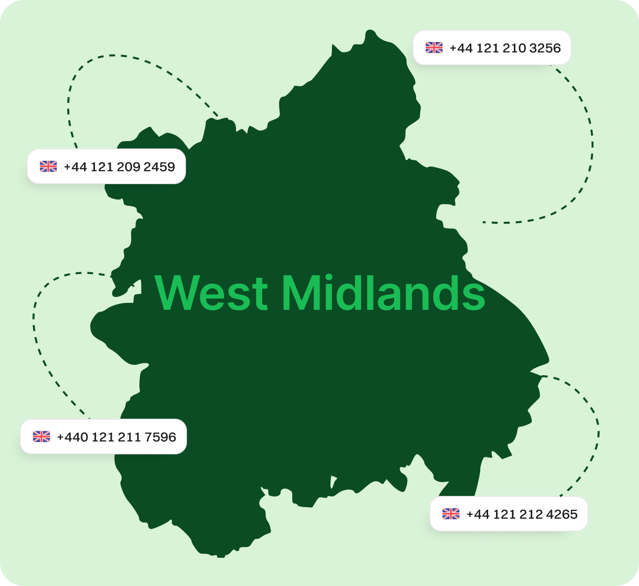 Make your business feel local in the West Midlands, including Birmingham, Wolverhampton, and Coventry. Virtual phone numbers make it easy for customers across the UK to reach you, save you from long-distance charges, and let you operate without a physical office.