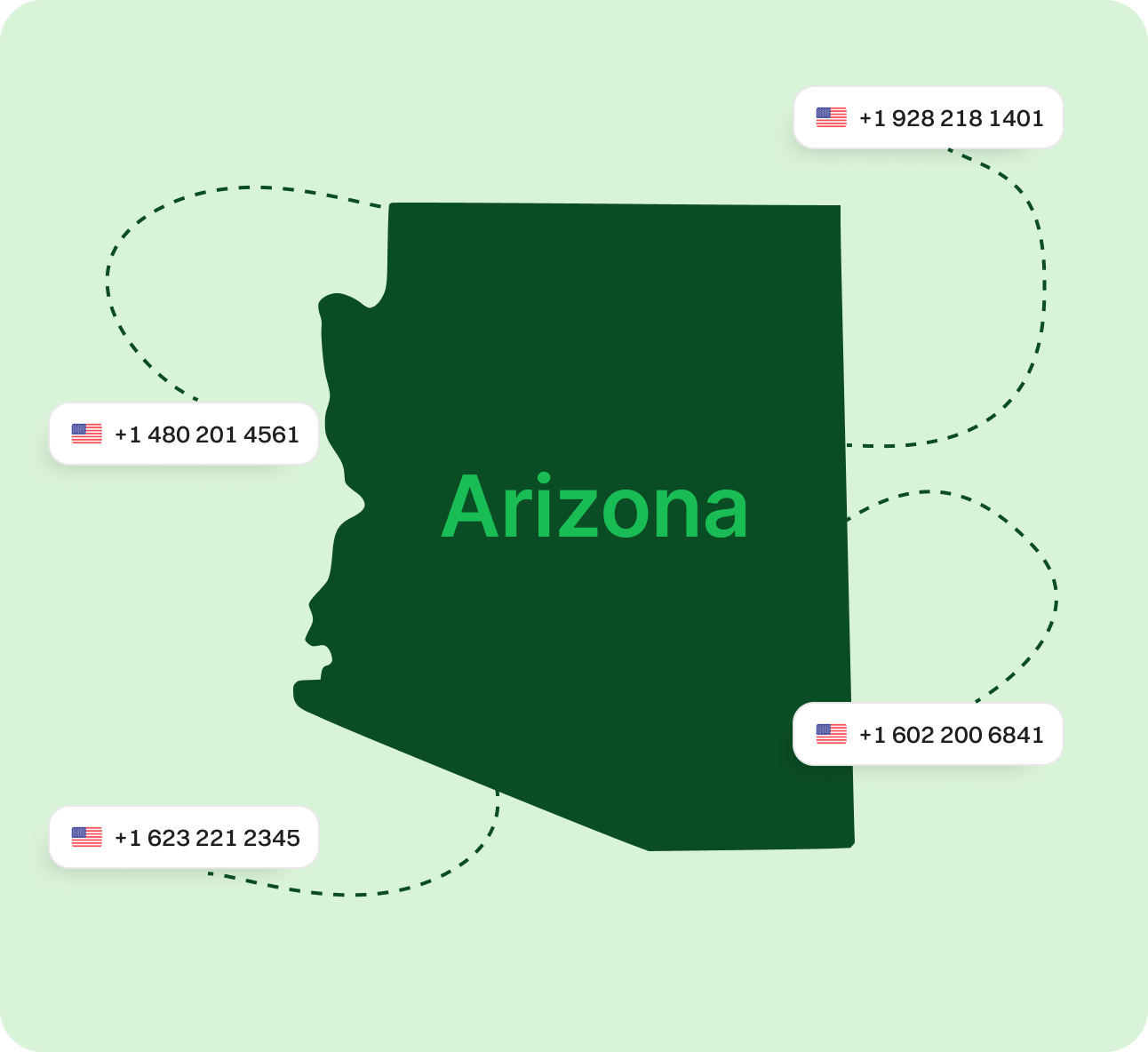 Get a Virtual Phone Number in Arizona Today Unlock the power of an Arizona virtual phone number and say goodbye to long-distance charges. Smoothly manage calls from any location, enhance your local presence, and establish trust with customers—all without the hassle of a physical office. Sign upRequest a Demo Endorsed by top industry leaders Trusted by industry experts for excellence and innovation. What is an Arizona Phone Number? An Arizona phone number is a digital number that operates through the internet, often using area codes such as 480, 520, 602, 623, and 928. It functions similarly to a traditional phone number but without the reliance on physical phone lines, offering greater flexibility and convenience. With an Arizona phone number, users can make and receive calls from anywhere, using the internet to connect. Unlike traditional numbers, Arizona phone numbers aren’t tied to a specific location or device, giving businesses and individuals the ability to establish a local presence in Arizona no matter where they are located globally. Whether for personal or business use, these numbers are easily accessible through various virtual phone service providers, eliminating the need for costly hardware or infrastructure. An example of an Arizona phone number would be +1 602 123-4567. How does Arizona virtual phone number work? An Arizona virtual phone number works by using cloud-based technology to route calls over the internet rather than relying on traditional phone lines. This allows users to make and receive calls through an internet connection instead of a physical phone or SIM card. When you dial an Arizona virtual number, the voice data is converted into digital packets, transmitted over the internet, and received by the intended recipient. The call is then converted back into audio signals, allowing both parties to communicate in real-time. This seamless process ensures that virtual phone numbers function just like regular phone numbers, offering a flexible, cost-effective alternative to traditional phone systems. How to Make the Most of Arizona Phone Numbers? Make & Receive Calls Send & Receive Texts Keep Work & Personal Separate Establish Local Presence Boost Marketing Efforts Make & Receive Calls Use your Arizona phone number for business calls while keeping your personal number private. Dialaxy lets you show your Arizona number on caller ID, ensuring professionalism. Get Started Send & Receive Texts Leverage text messaging to connect with customers. Use your Arizona number to send updates, promotions, and reminders, offering a convenient way to stay in touch. Get Started Keep Work & Personal Separate Dialaxy helps you maintain privacy by separating business and personal communications. Manage calls and messages for work without interruptions to personal life. Get Started Establish Local Presence Build trust with a local Arizona number, even if your business operates remotely. A recognizable area code helps you connect with customers more effectively. Get Started Boost Marketing Efforts Improve your campaigns by using your Arizona number for outreach. Localized numbers increase customer engagement and response rates for promotions and offers. Get Started Specific Area Codes for Arizona Area Code Area Served 480 Eastern Phoenix suburbs, including Scottsdale, Tempe, and Chandler 520 Southern Arizona, including Tucson, Nogales, and Sierra Vista 602 Central Phoenix and its immediate surrounding areas 623 Western Phoenix suburbs, including Glendale, Peoria, and Sun City 928 Northern and western Arizona, including Flagstaff, Prescott, Yuma, and the Grand Canyon area Why choose Dialaxy for Arizona virtual phone number? Customizable Plans for Flexibility Dialaxy offers a variety of pricing plans tailored to your needs, allowing you to choose features and services that best suit your personal or business requirements without overpaying. Quick Setup with Zero Hassle Setting up an Arizona virtual phone number with Dialaxy is simple and requires no additional hardware. Enjoy a seamless setup process and start making calls within minutes. Scalable Solutions for Growth As your business expands, Dialaxy grows with you. You can easily scale your services by adding multiple Arizona numbers, ensuring smooth communication with your increasing customer base. Round-the-Clock Support Dialaxy provides 24/7 customer support to resolve any issues or answer questions promptly, keeping your business communication efficient and stress-free. Enhanced Call Management Features Leverage advanced features like call forwarding, voicemail-to-email, and analytics to manage calls more effectively and deliver exceptional customer service. Cost-Effective Pricing With Dialaxy, you get premium services at affordable prices. Whether you're a small business or a large enterprise, you can enjoy professional telephony solutions without exceeding your budget. Get an Arizona Number for Your Business Step 1 Create an Account Sign up on Dialaxy by visiting their website and completing the simple registration process. Step 2 Navigate to the "Add New Number" Section Go to your account dashboard, find the "Add New Number" option, and select it. Step 3 Select USA and Choose Arizona From the country list, choose "USA," then filter your options by selecting "Arizona" as your desired location. Step 4 Pick Your Arizona Number Browse through the list of available Arizona numbers, select the one you want, and add it to your cart. Step 5 Make Payment and Verify Details Complete the payment process and submit any required documentation to verify your account. Step 6 Activate and Start Using Your Number Once activated, your Arizona virtual phone number is ready to use for making and receiving calls. Explore More States Alaska California Colorado Hawaii Idaho Montana Nevada New Mexico Oregon Utah Washington Wyoming View all Frequently Asked Questions What is an Arizona virtual phone number?An Arizona virtual phone number is a cloud-b