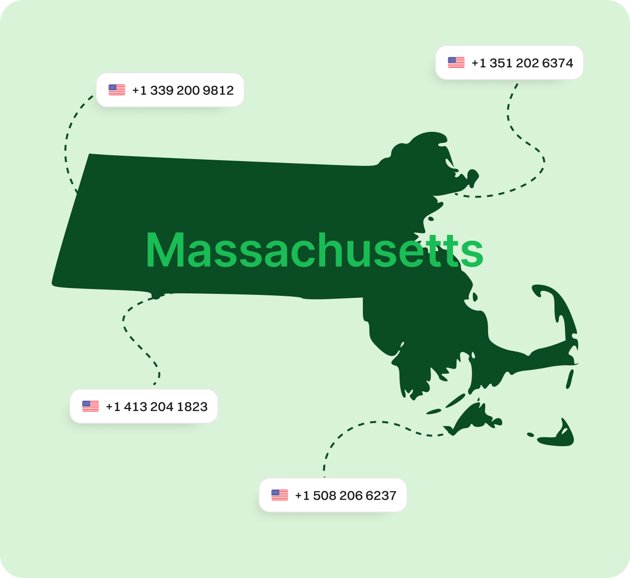 Get a Virtual Phone Number for Massachusetts Today! Secure a Massachusetts VoIP number to cut down on long-distance expenses, create a local identity, and build customer confidence—without the need for a physical office. Stay reachable and streamline business communications effortlessly from any location. Sign upRequest a Demo Endorsed by top industry leaders Trusted by industry experts for excellence and innovation. What is a Massachusetts phone number? A Massachusetts VoIP number is a digital phone number that operates over the internet, typically using area codes like 617, 508, 781, and more. Unlike traditional phone numbers, a Massachusetts VoIP number is not tied to a specific physical location or device, offering greater flexibility and accessibility. With a Massachusetts VoIP number, users can make and receive calls from anywhere with an internet connection. These numbers function just like regular phone numbers but without the constraints of physical landlines, making them cost-effective and efficient for business or personal use. An example of a Massachusetts VoIP number would be +1 617-555-1234. How does a Massachusetts virtual phone number work? A Massachusetts virtual phone number works by using cloud-based technology to route calls over the internet rather than relying on traditional phone lines. This allows users to make and receive calls through an internet connection instead of a physical phone or SIM card. When you dial a Massachusetts virtual number, the voice data is converted into digital packets, transmitted over the internet, and received by the intended recipient. The call is then converted back into audio signals, allowing both parties to communicate in real-time. This seamless process ensures that virtual phone numbers function just like regular phone numbers, offering a flexible, cost-effective alternative to traditional phone systems. How to make the most of Massachusetts phone numbers? Make & Receive Calls Send & Receive Texts Keep Work & Personal Separate Establish Local Presence Boost Marketing Efforts Make & Receive Calls Use your Massachusetts phone number for business calls while keeping your personal number private. Dialaxy lets you show your Massachusetts number on caller ID, ensuring professionalism. Get Started Send & Receive Texts Leverage text messaging to connect with customers. Use your Massachusetts number to send updates, promotions, and reminders, offering a convenient way to stay in touch. Get Started Keep Work & Personal Separate Dialaxy helps you maintain privacy by separating business and personal communications. Manage calls and messages for work without interruptions to your personal life. Get Started Establish Local Presence Build trust with a local Massachusetts number, even if your business operates remotely. A recognizable area code helps you connect with customers more effectively. Get Started Boost Marketing Efforts Improve your campaigns by using your Massachusetts number for outreach. Localized numbers increase customer engagement and response rates for promotions and offers. Get Started Specific area codes for Massachusetts Area Code Area Served 339 Lynn, Woburn, Peabody 351 Worcester, Fitchburg, Leominster 413 Springfield, Pittsfield, Northampton 508 Worcester, Plymouth, Taunton 617 Boston, Cambridge, Quincy 774 Brockton, Fall River, New Bedford 781 Waltham, Brookline, Lynn 857 Boston, Brookline, Somerville 978 Lowell, Lawrence, Peabody Why choose Dialaxy for a Massachusetts virtual phone number? Customizable Plans for Flexibility Dialaxy offers a variety of pricing plans tailored to your needs, allowing you to choose features and services that best suit your personal or business requirements without overpaying. Quick Setup with Zero Hassle Setting up a Massachusetts virtual phone number with Dialaxy is simple and requires no additional hardware. Enjoy a seamless setup process and start making calls within minutes. Scalable Solutions for Growth As your business expands, Dialaxy grows with you. You can easily scale your services by adding multiple Massachusetts numbers, ensuring smooth communication with your increasing customer base. Round-the-Clock Support Dialaxy provides 24/7 customer support to resolve any issues or answer questions promptly, keeping your business communication efficient and stress-free. Enhanced Call Management Features Leverage advanced features like call forwarding, voicemail-to-email, and analytics to manage calls more effectively and deliver exceptional customer service. Cost-Effective Pricing With Dialaxy, you get premium services at affordable prices. Whether you're a small business or a large enterprise, you can enjoy professional telephony solutions without exceeding your budget. How to buy a Massachusetts number for your business? Step 1 Create an Account Sign up on Dialaxy by visiting their website and completing the simple registration process. Step 2 Navigate to the "Add New Number" Section Go to your account dashboard, find the "Add New Number" option, and select it. Step 3 Select USA and Search for Your Preferred Area Codes From the country list, choose "USA," then search area code according to your phone number need. Step 4 Pick Your Massachusetts Number Browse through the list of available Massachusetts numbers, select the one you want, and add it to your cart. Step 5 Make Payment and Verify Details Complete the payment process and submit any required documentation to verify your account. Step 6 Activate and Start Using Your Number Once activated, your Massachusetts virtual phone number is ready to use to make and receive calls. Explore More States Connecticut Maine New Hampshire New Jersey New York Rhode Island Pennsylvania Vermont View all Frequently Asked Questions What is a Massachusetts virtual phone number?A Massachusetts virtual phone number is a cloud-based number with area codes like 617, 508, or 781 that allows users to make and receive calls over the internet instead of traditio